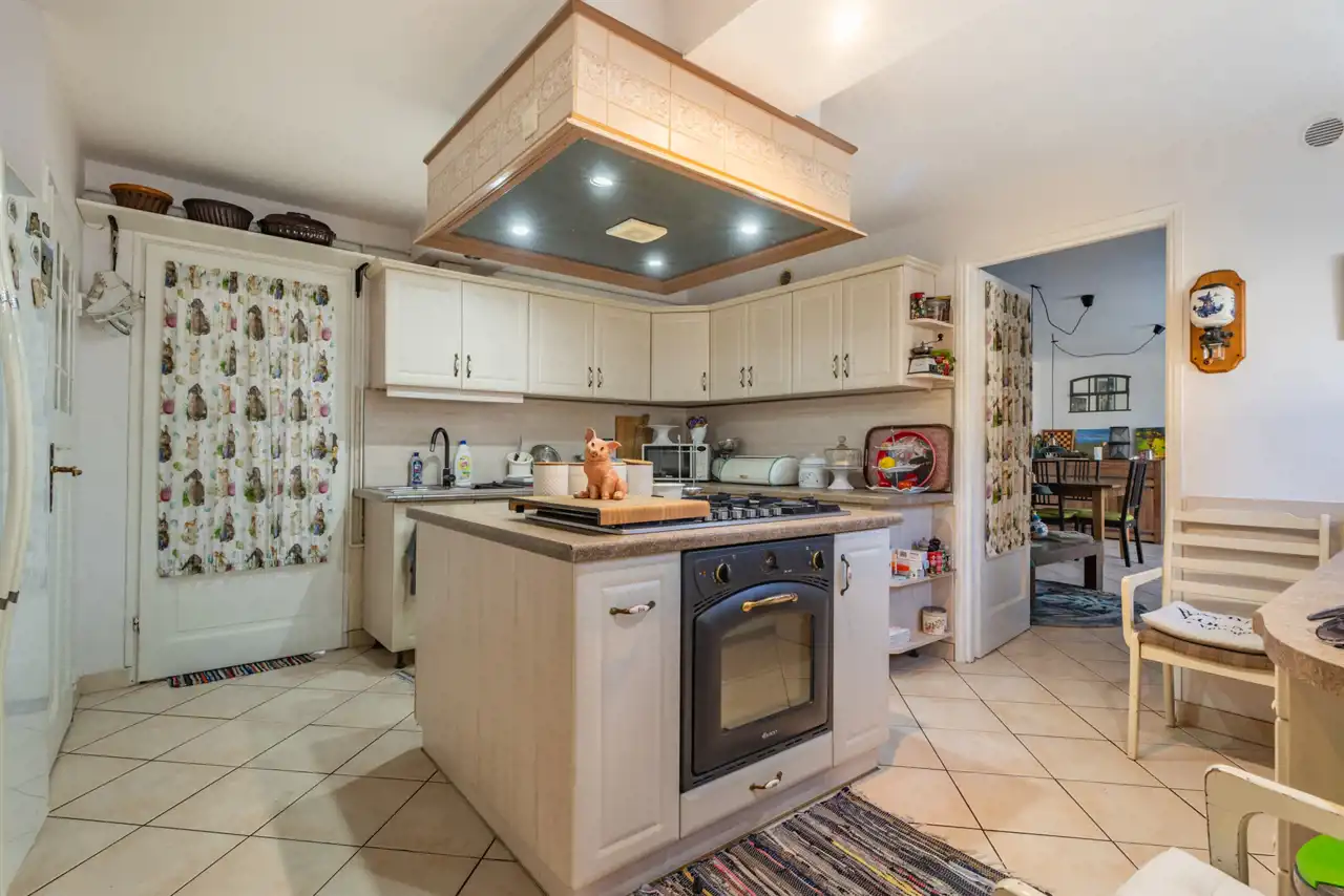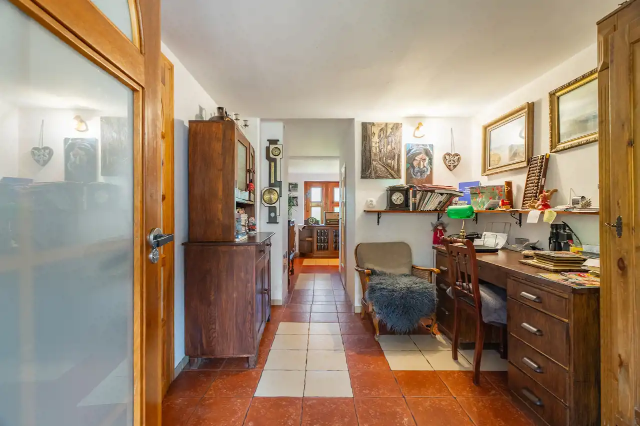 Na parterze znajduje się kuchnia z salonem, 4 sypialnie z łazienkami oraz pokój wypoczynkowy również z łazienka i wyjściem do ogrodu, kuchnia letnia i 3 pomieszczenia pomocnicze.