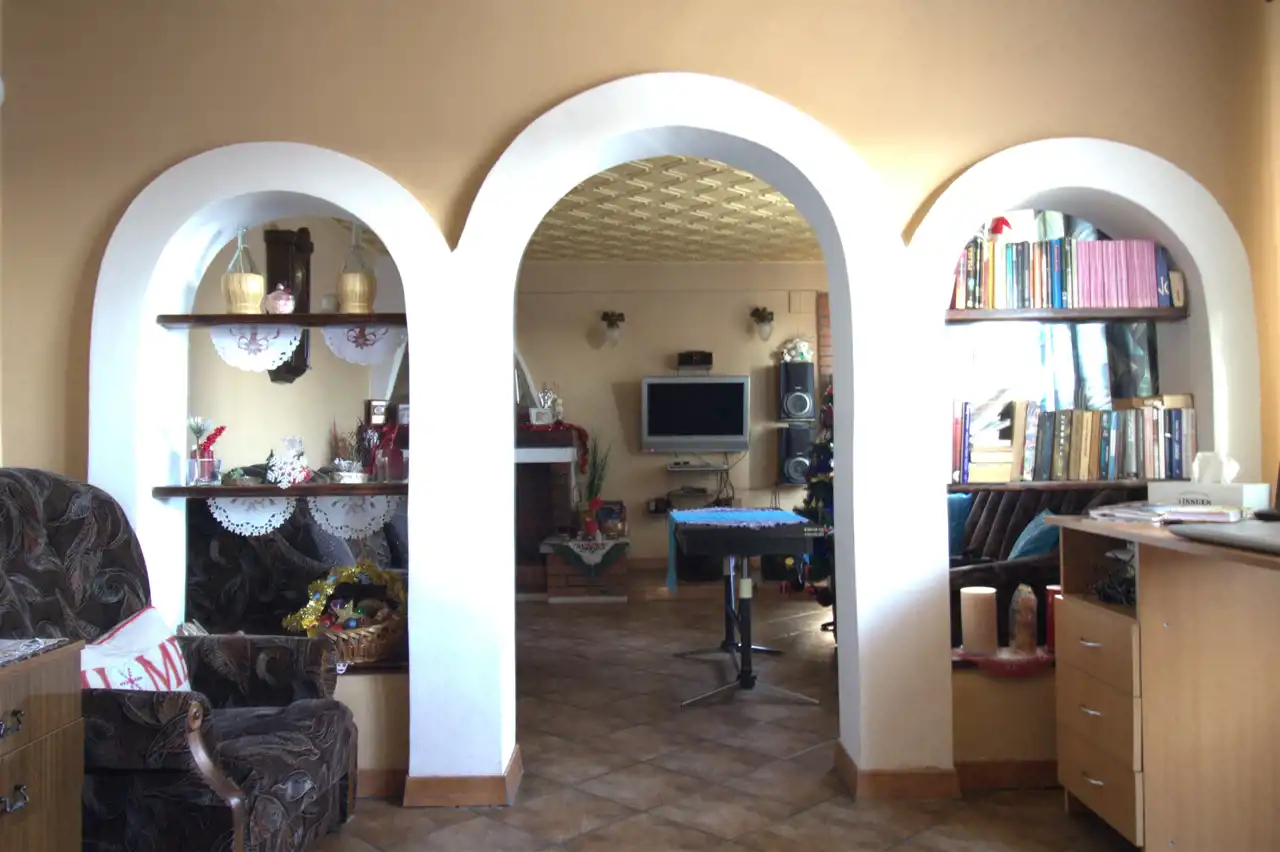 Wnętrza domu są jasne i przestronne, utrzymane w klasycznym stylu. Kominek na piętrze nadaje wnętrzom przytulny charakter i pełni funkcję dodatkowego źródła ciepła. Układ pomieszczeń pozwala na komfortowe użytkowanie domu jako dwupoziomowej całości, a jednocześnie daje możliwość adaptacji do dwóch niezależnych mieszkań, np. dla rodziny wielopokoleniowej lub pod wynajem.