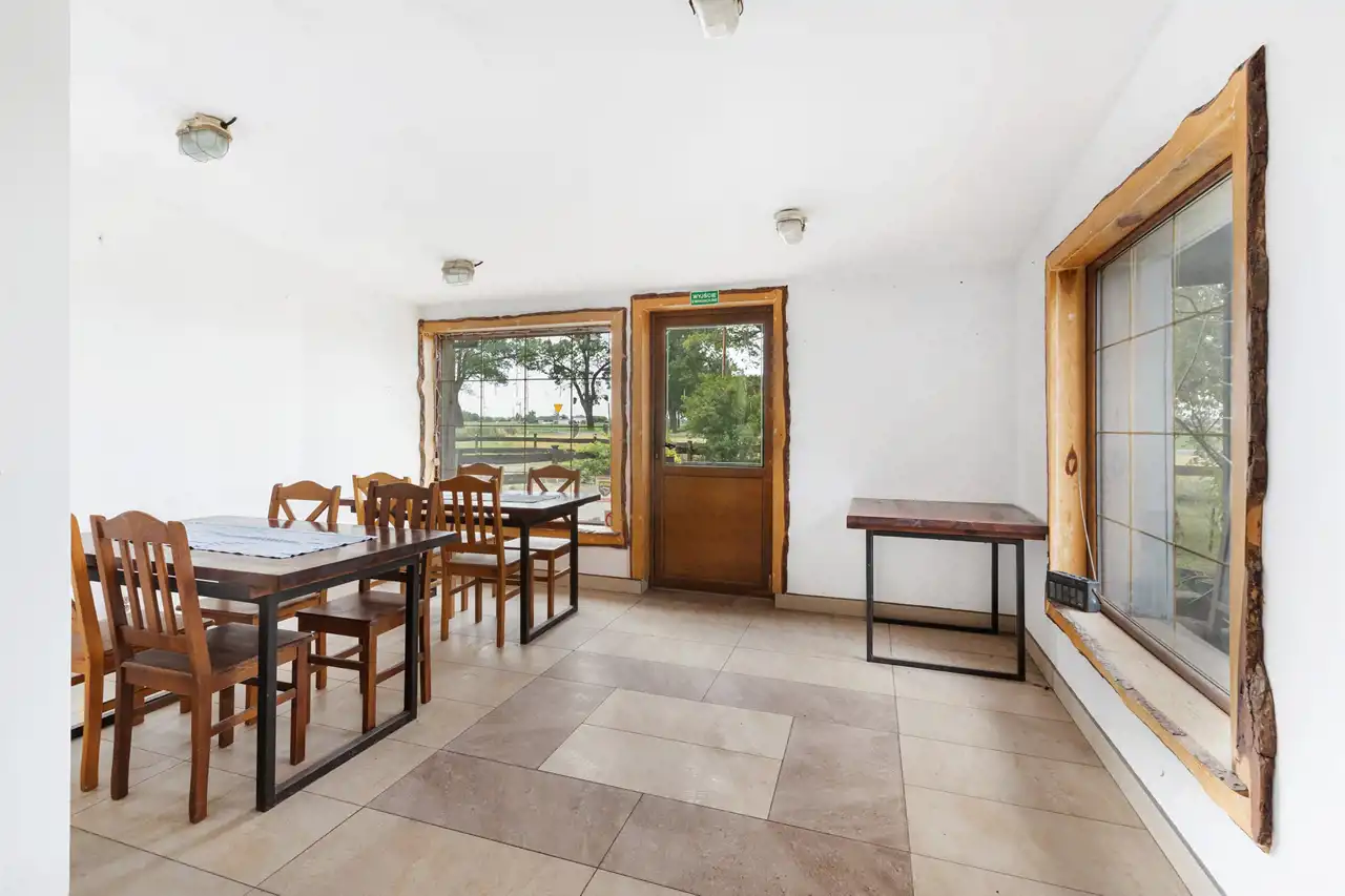 Część budynku została zaadaptowana na przestrzeń mieszkalną – idealną dla właściciela obiektu lub pracowników. Dodatkowo do dyspozycji jest magazyn oraz kotłownia ( piec na ekogroszek )