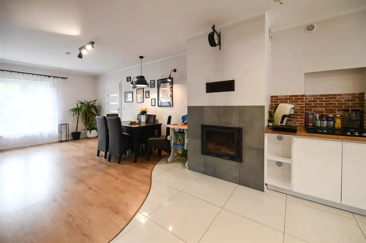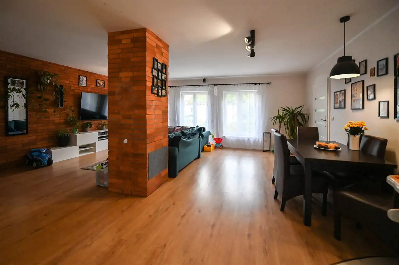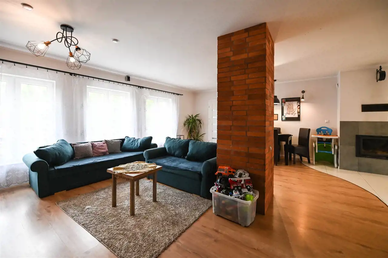 Dom idealny do zamieszkania przez dwie rodziny (niezależne części mieszkalne). Główna część mieszkalna znajduje się na pierwszym piętrze gdzie mamy ogromy salon z jadalnią, aneks kuchenny, sypialnię oraz łazienkę.