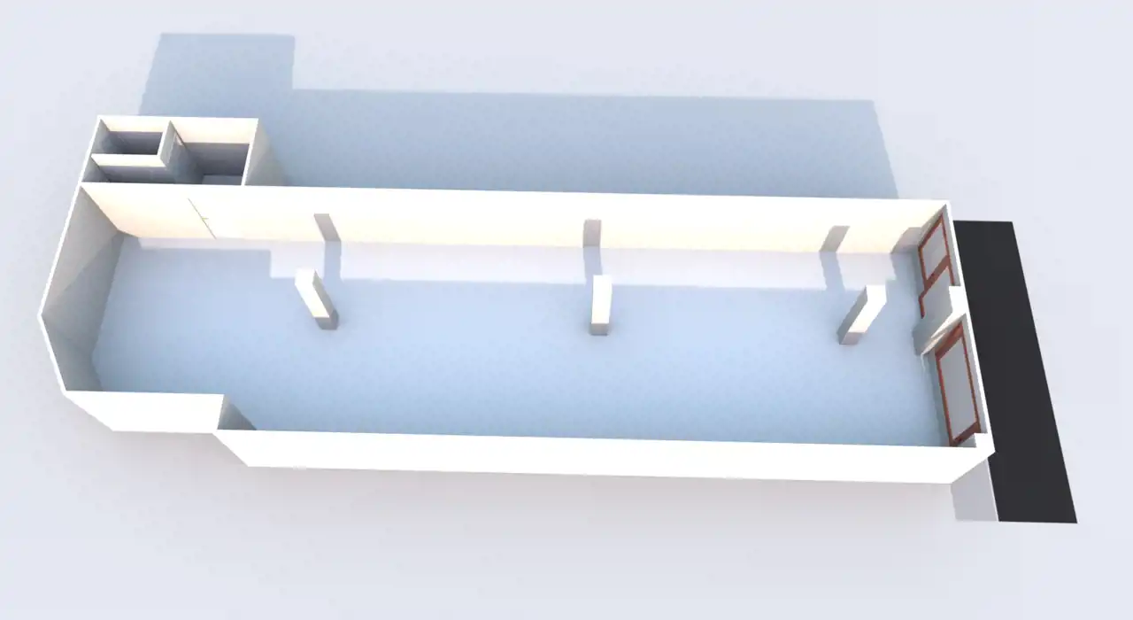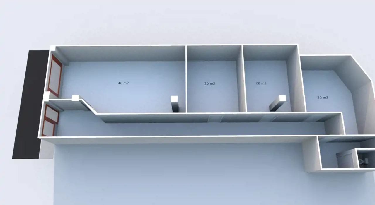 Lokal zostanie podzielony na mniejsze pomieszczenia o powierzchni: pomieszczenie od frontu około 40m2 oraz trzy pomieszczenia w głębi o powierzchni po około 20m2. Wspólna komunikacja oraz dostęp do toalety. Każde z pomieszczeń może być wyposażone w instalację wodną i kanalizacyjną.