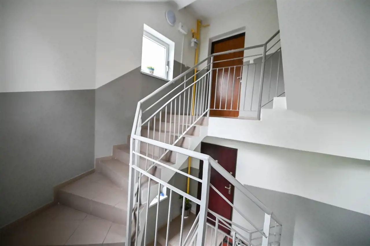 Budynek po termomodernizacji, nowa elewacja i ocieplenie, wyremontowana klatka schodowa.