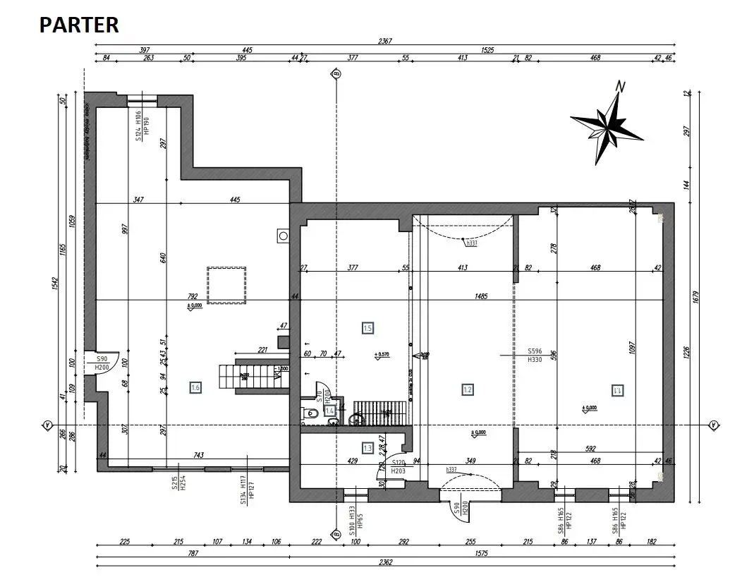Parter budynku składa się z trzech głównych pomieszczeń warsztatowych, pomieszczenia magazynowego w przybudówce budynku, pomieszcznia użytkowego oraz wc. Łączna powierzchnia parteru to 250,69m2.