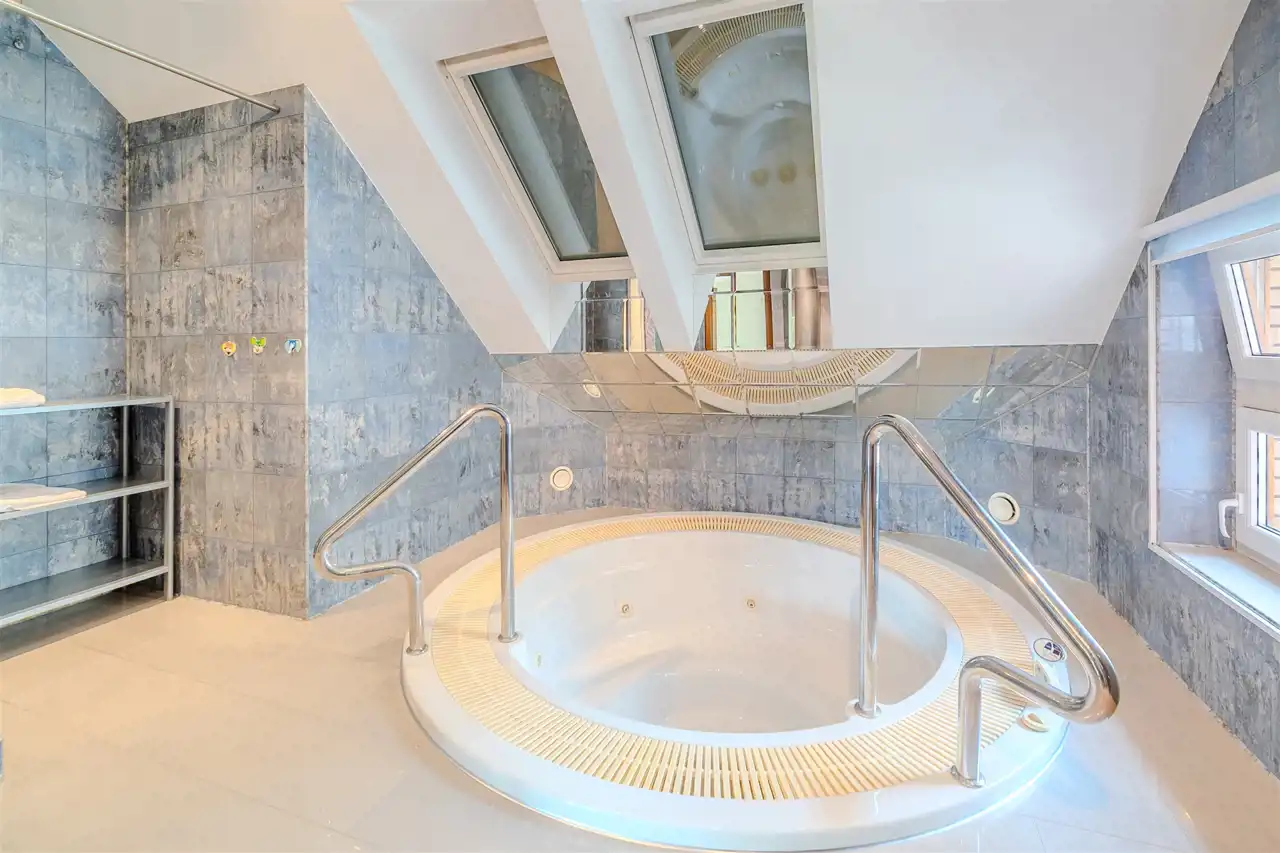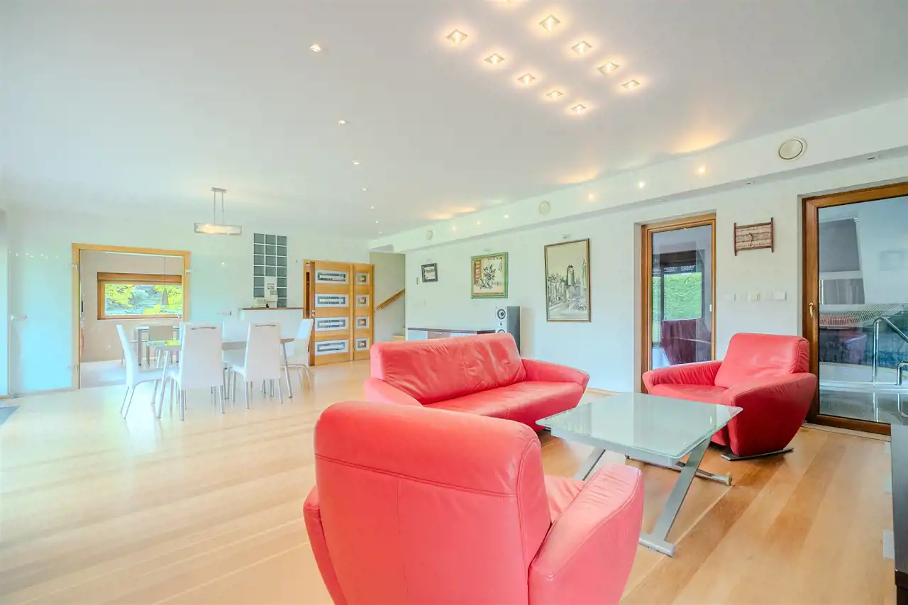 Na parterze znajduje się bardzo przestronny salon, z dużymi drzwiami tarasowymi, dzięki czemu jest znakomicie doświetlony naturalnym światłem. To idealne miejsce do spędzania czasu z rodziną i przyjaciółmi. Podłogi wykonane są z litego drewna dębowego (nieklejonego warstwowo), co gwarantuje niezrównaną trwałość i estetykę. Co więcej, deski w salonie są jednej długości, co dodaje wnętrzu elegancji i spójności. Przedłużeniem strefy relaksu jest pokój z jacuzzi - prywatna oaza spokoju dostępna na wyciągnięcie ręki.