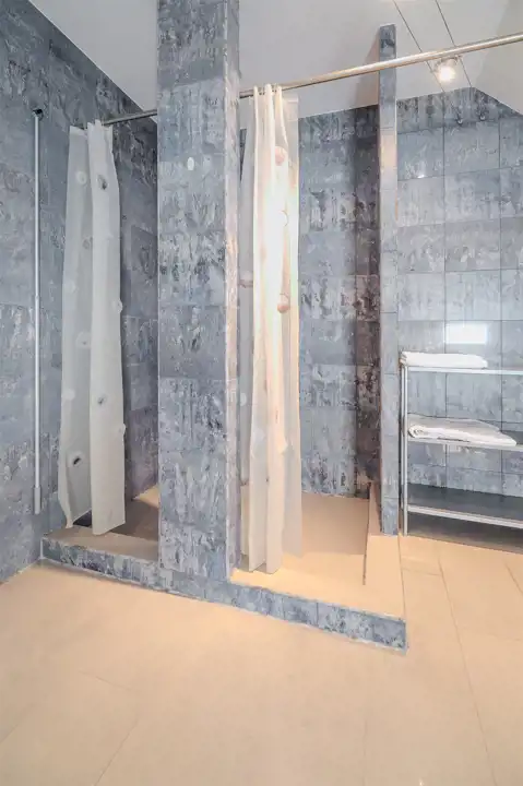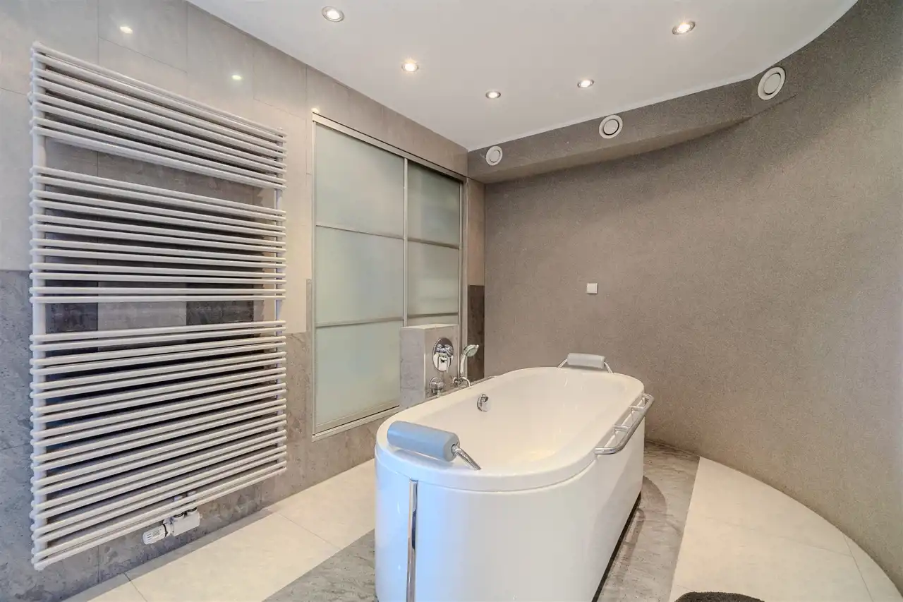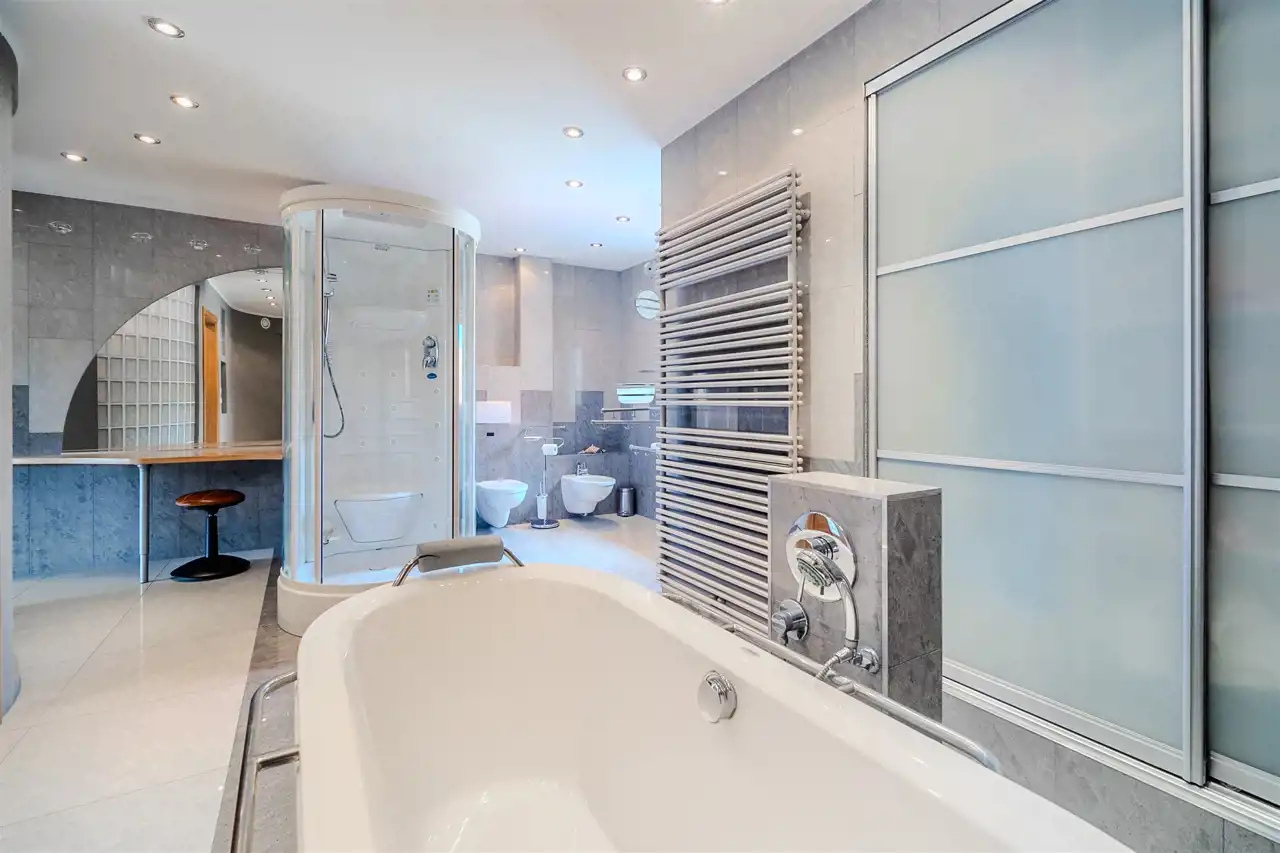 Na półpiętrze znajduje się strefa odpoczynku – zaciszna sypialnia połączona z pokojem kąpielowym - domowym SPA, gdzie można zarówno zażywać kąpieli w wolnostojącej wannie jak i korzystać z kabiny prysznicowej z natryskiem i łaźnią rzymską. Jego niepowtarzalny charakter podkreśla ściana w kształcie łuku, wykonana z luksfery. To piękne rozwiązanie architektoniczne, które nie tylko dodaje wnętrzu elegancji, ale także tworzy niezwykłe efekty świetlne, gdy naturalne światło delikatnie przenika przez ścianę.