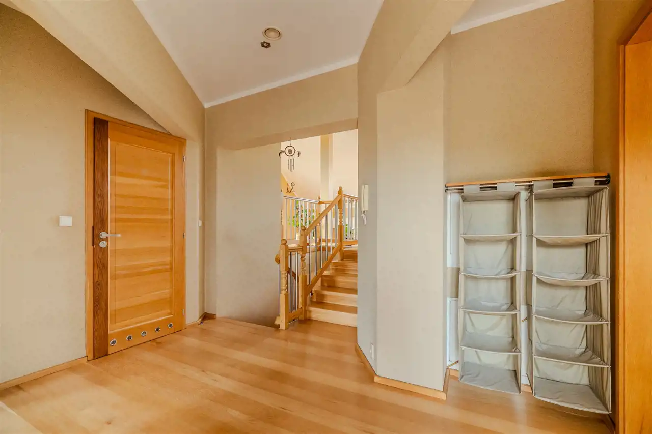 Drzwi wewnętrzne i schody dębowe. W pokojach podłogi dębowe z litego drewna.