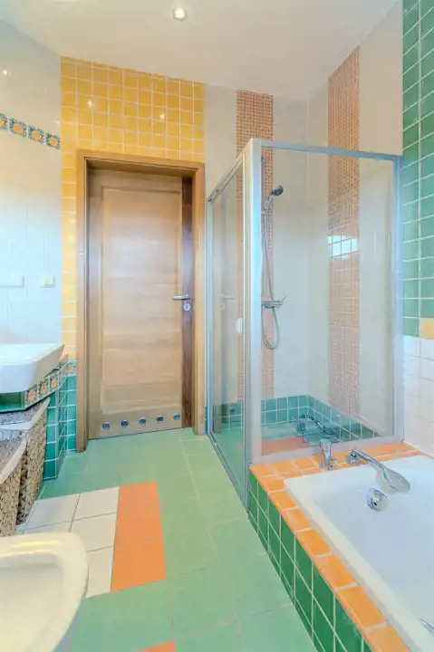 Na ścianach pomieszczeń na parterze wielobarwna powłoka natryskowa, na piętrze tynk ceramiczny.