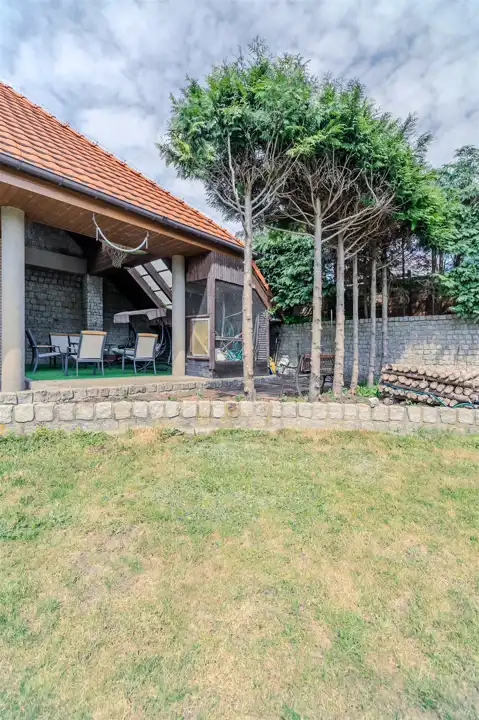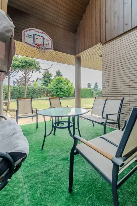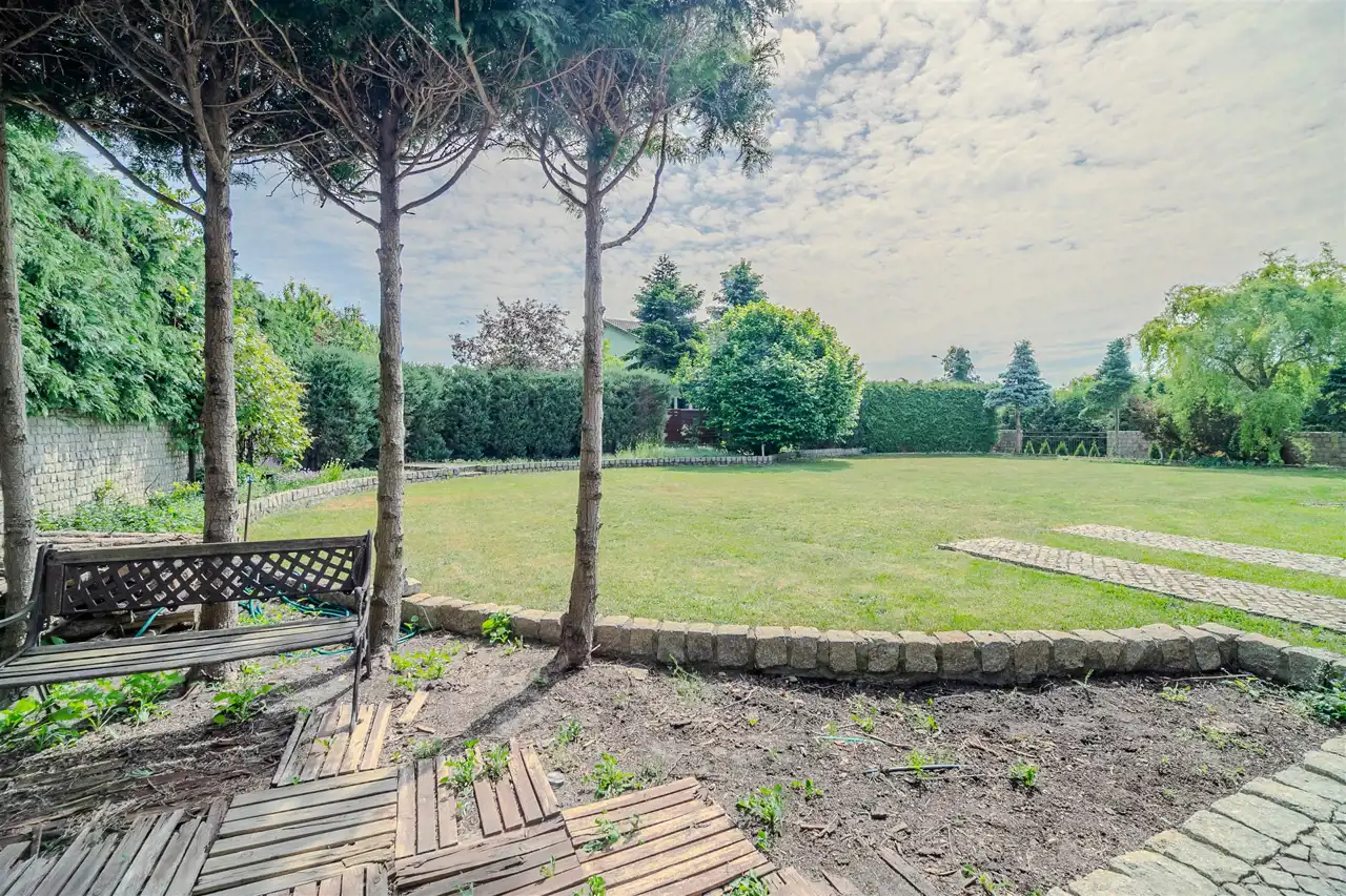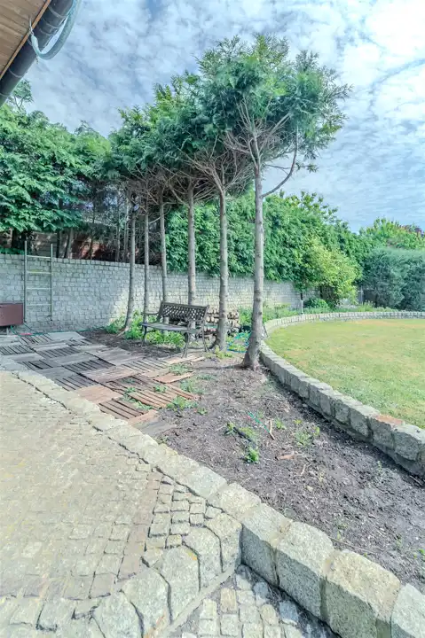 Ogród to duży atut tej nieruchomości. Jest starannie utrzymany, wyposażony w system nawadniania i oświetlenia, a wysoka roślinność zapewnia prywatność. Dzięki zadaszonej wiacie ogród stanowi idealne miejsce do relaksu i spotkań w każdą pogodę. Wiata wyposażona została w oświetlenie i gniazda prądu (siła). Ścieżki w ogrodzie i wokół domu oraz taras zostały wyłożone kostką brukową.