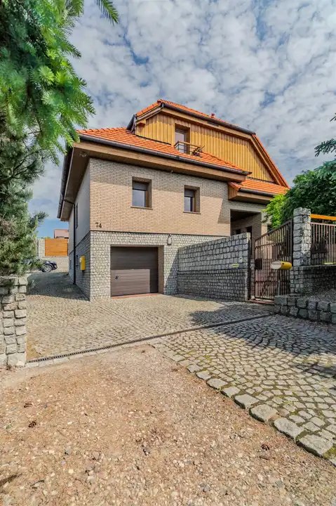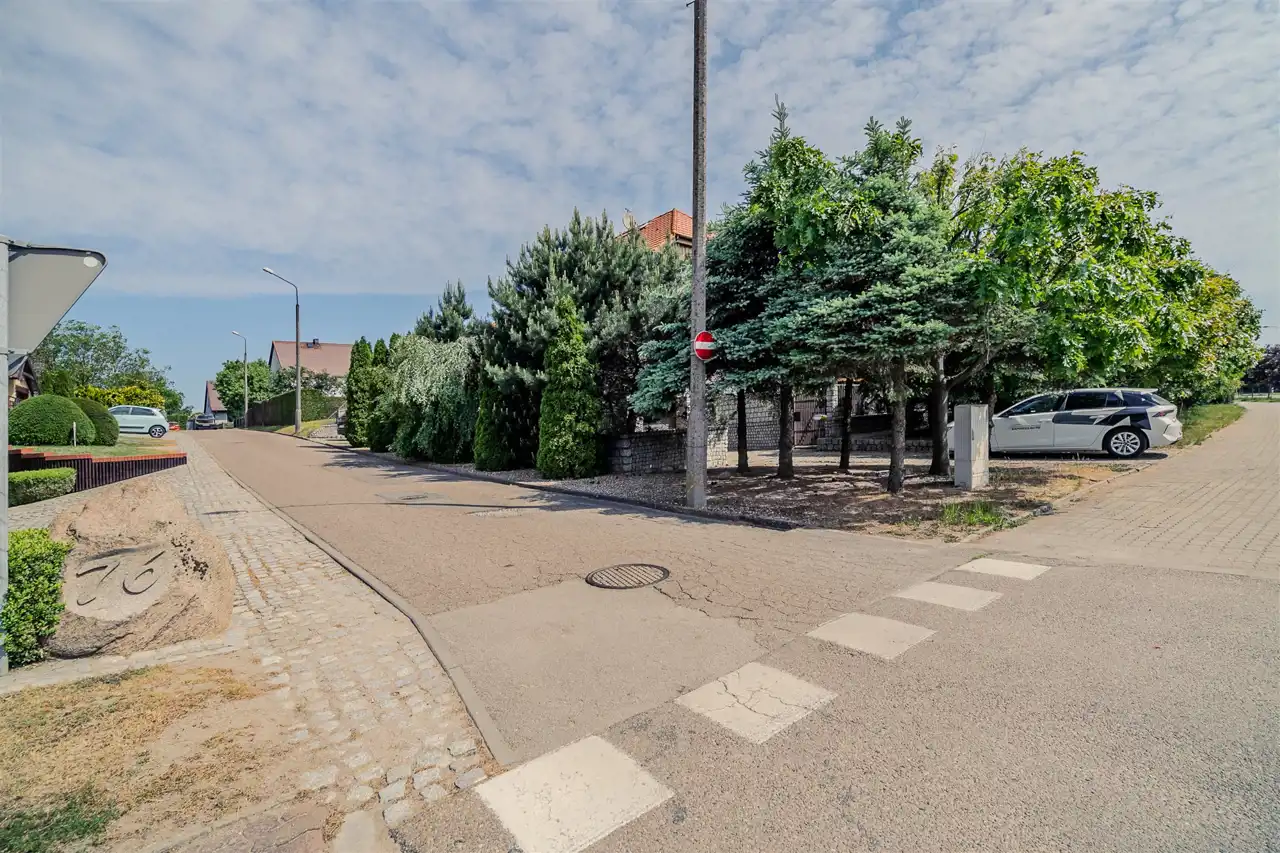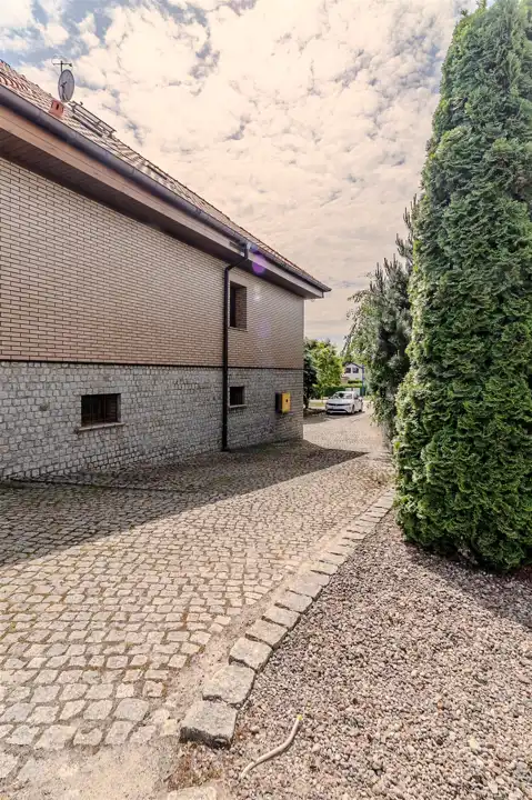 Dwa garaże. Garaż frontowy jest bezpośrednio połączony z domem, co stanowi nie tylko funkcjonalne rozwiązanie, ale także dodaje wygody w codziennym życiu, dzięki temu zakupy można wnosić bezpośrednio do mieszkania, omijając niewygodę noszenia ich na zewnątrz. Przed bocznym garażem znajduje się brukowany podjazd z miejscem na dwa samochody. Co więcej, garaż ten jest dwustronny, co jest świetnym rozwiązaniem - daje możliwość wjechania z ulicy i wyjechania z drugiej strony na ogród. To idealne miejsce do odkurzania lub mycia samochodu w komfortowych warunkach. Wszystkie bramy garażowe sterowane elektrycznie. To dom zaprojektowany z myślą o komforcie i funkcjonalności.