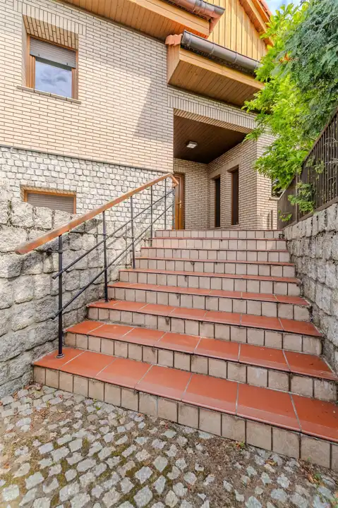 Otoczenie domu bogate jest w elementy drewniane połączone z kamiennym brukiem, co tworzy unikalną i atrakcyjną estetykę, która łączy w sobie naturalność i tradycję.