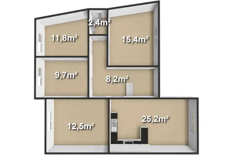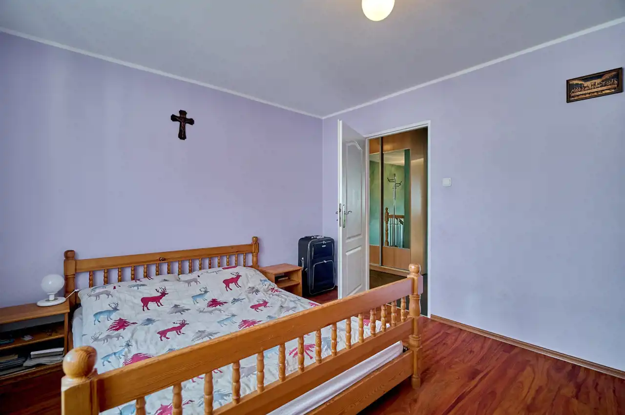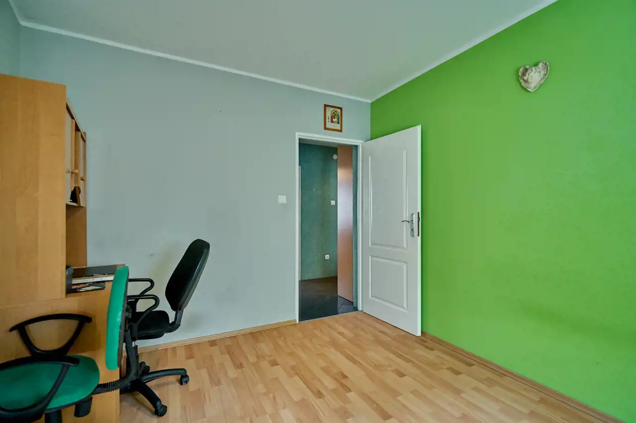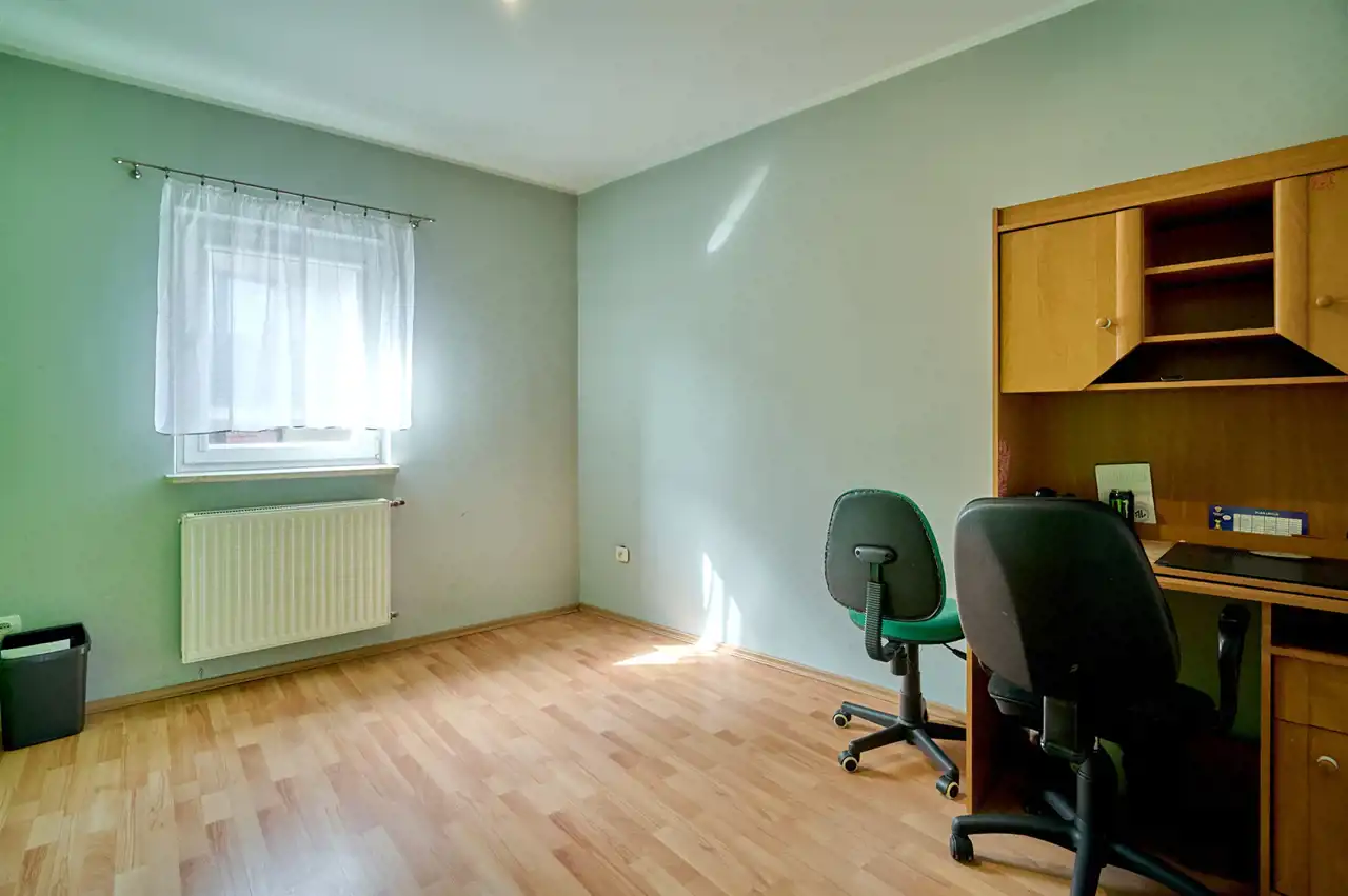 - Cztery ustawne pokoje (15,4 m2, 12,5 m2, 11,8 m2 oraz 9,7 m2).