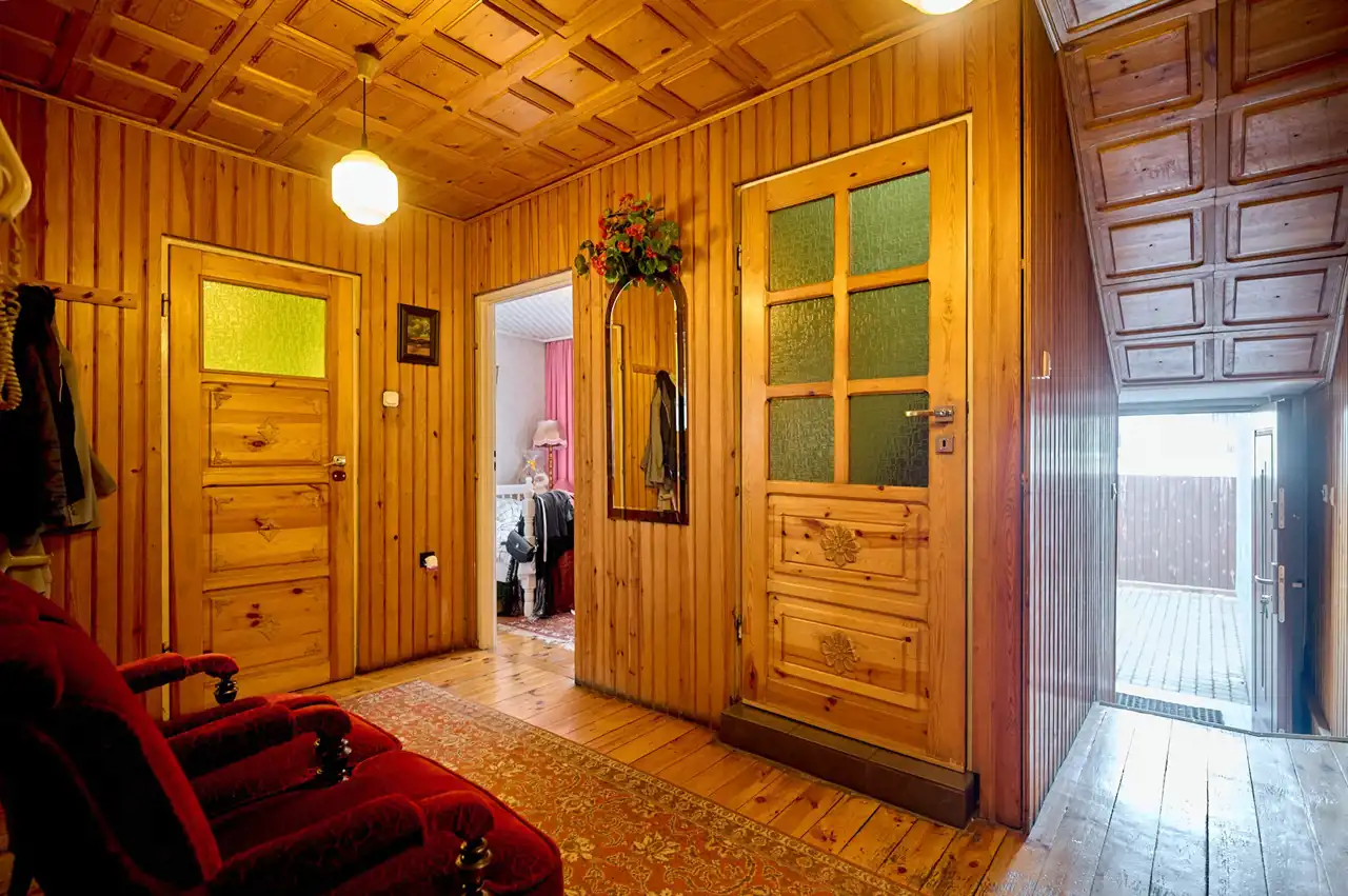 - Własny garaż: Na działce o powierzchni 196 m2 znajduje się drewniany garaż.