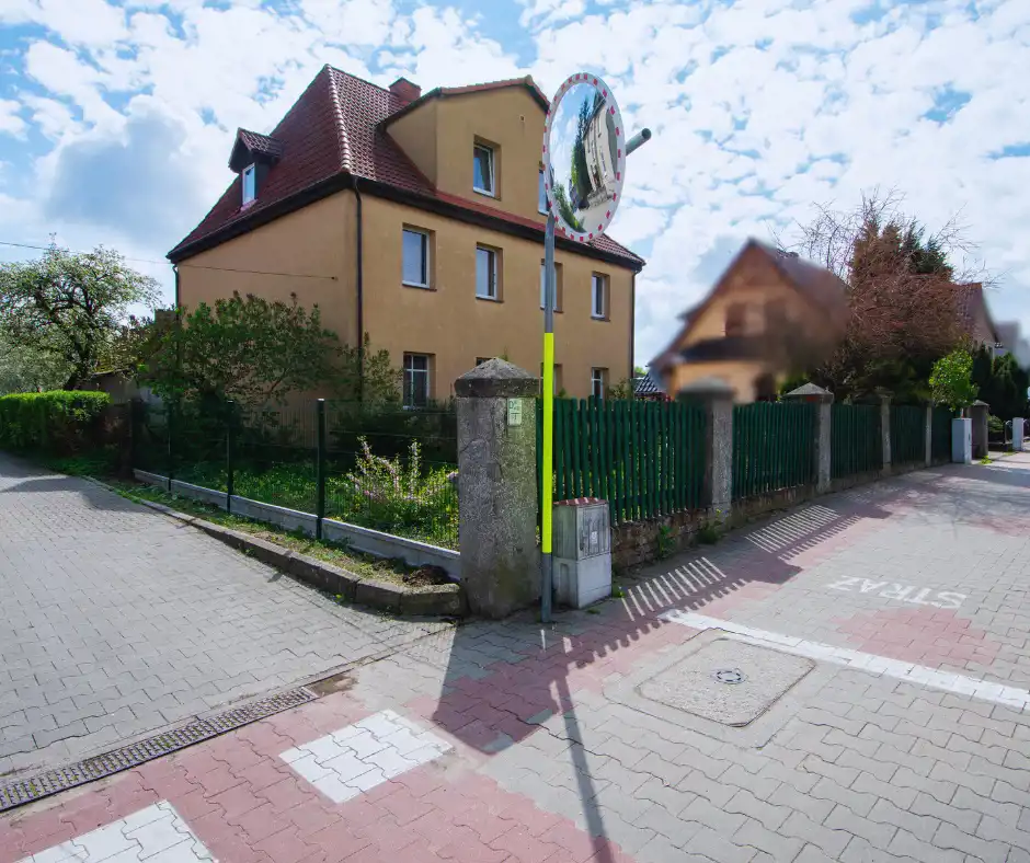 - Otoczenie: Działka jest ogrodzona, z podjazdem wyłożonym kostką brukową, co zapewnia wygodny dojazd i komfort użytkowania. Przed domem od strony ulicy znajduje się ogródek kwietny.