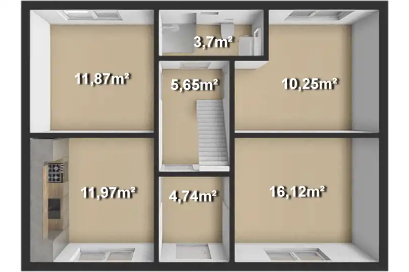 - 2 ustawne sypialnie (11,87 m² i 10,25 m²) - prywatna strefa wypoczynku, oddzielona od frontowej części budynku dodatkowym korytarzem z drzwiami,
