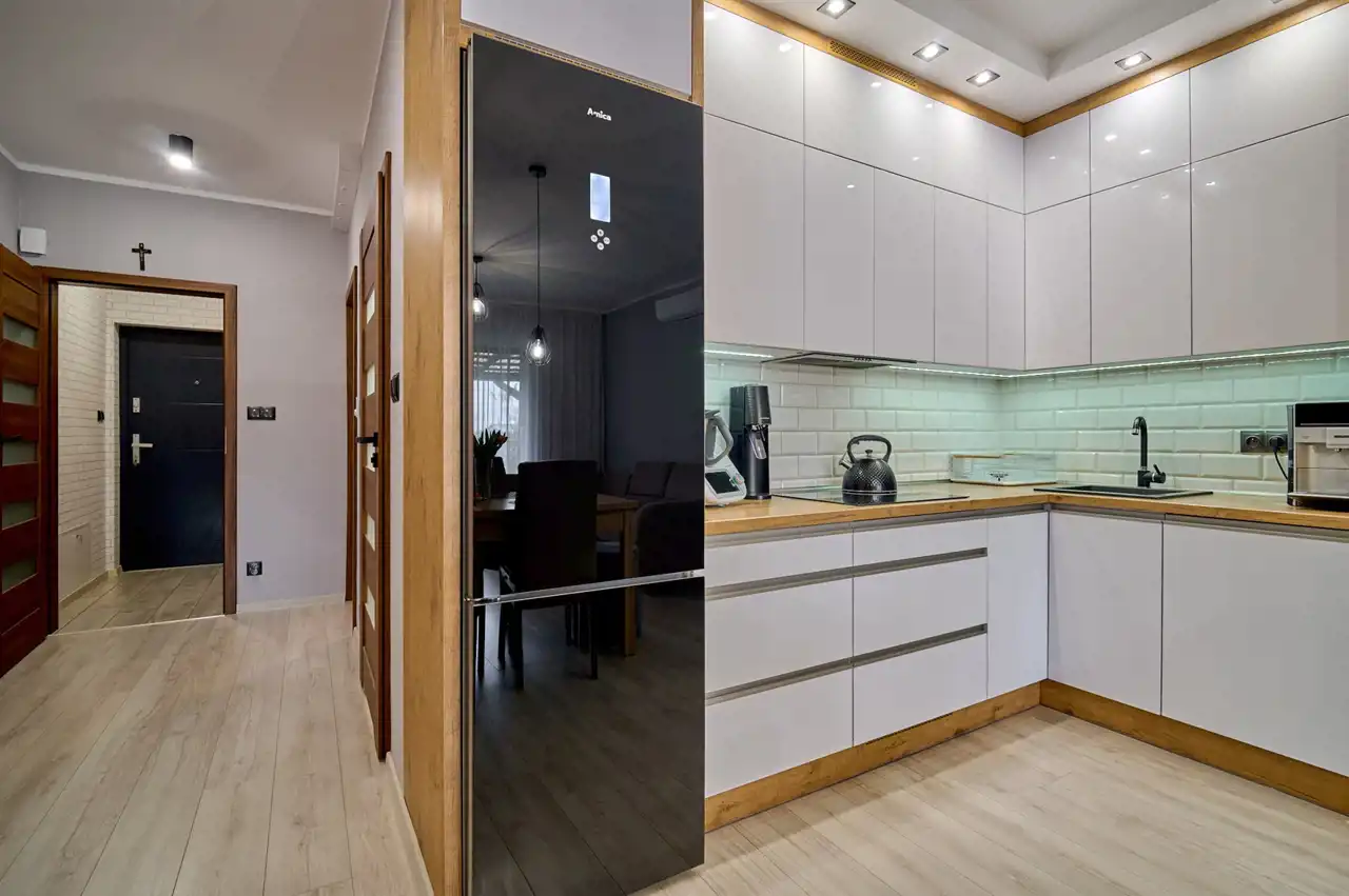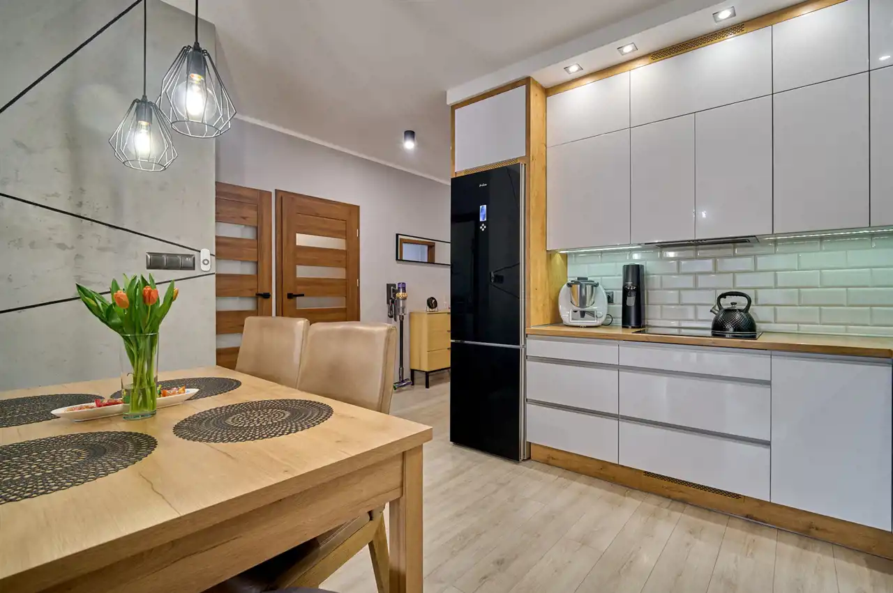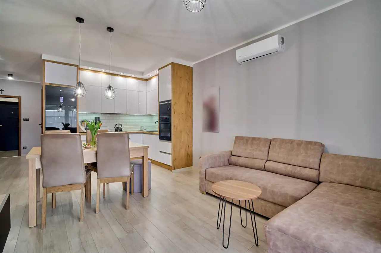 Duży salon połączony z kuchnią oraz pozostawione meble i zabudowy - nie musisz zaczynać od zera.
