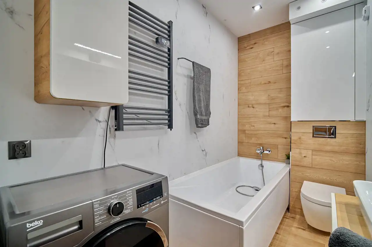 - System ogrzewania podłogowego w całym mieszkaniu, dodatkowo grzejnik w łazience