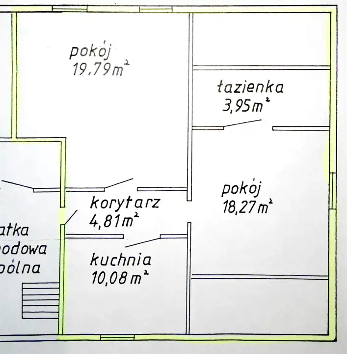 Mieszkanie składa się z 2 pokoi o powierzchniach 19,79m2 i 18,27m2. Dodatkowo, pomieszczenie o pow. przyp. ok. 12m2 zaadoptowano na 3 pokój (bez okna).