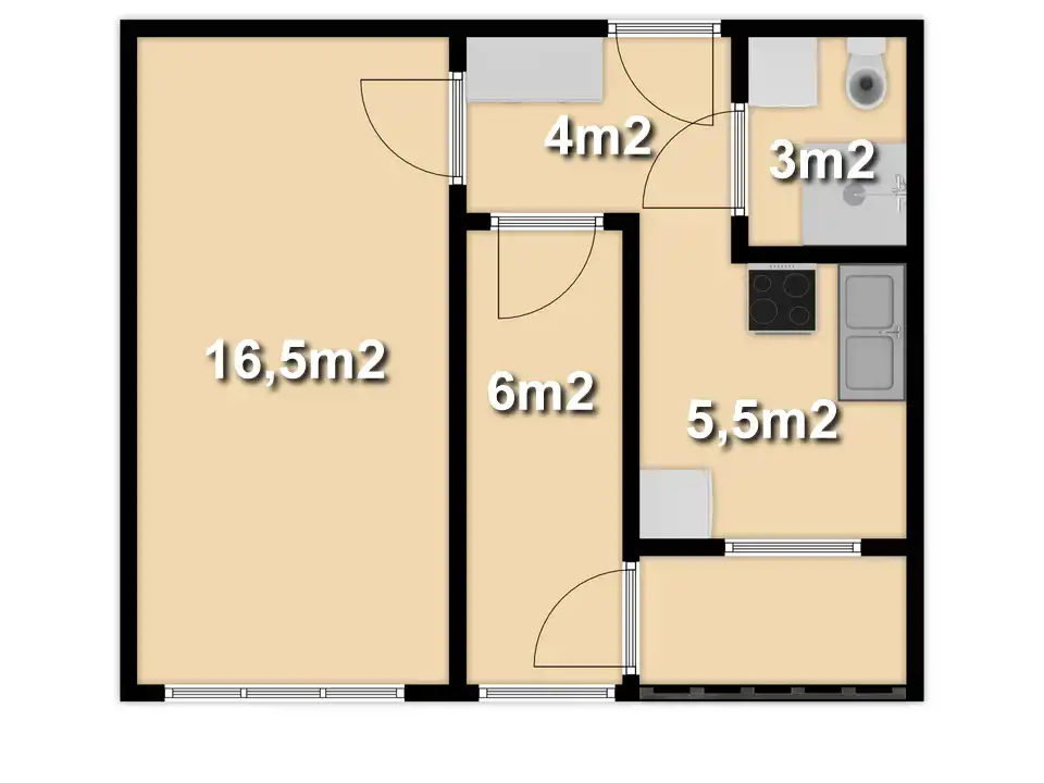 W skład lokalu wchodzą 2 pokoje o powierzchni ok. 16,5m2 i 6m2, kuchnia o powierzchni ok. 5,5m2 oraz łazienka wraz z WC o powierzchni ok. 3m2