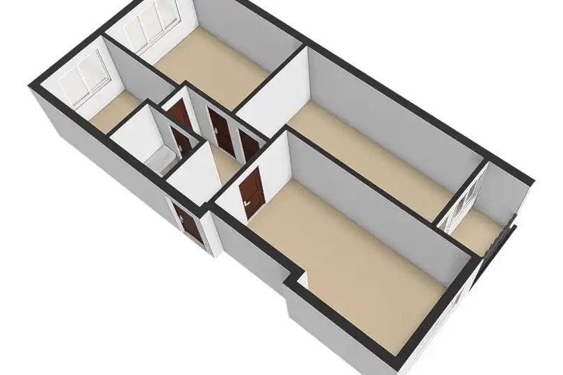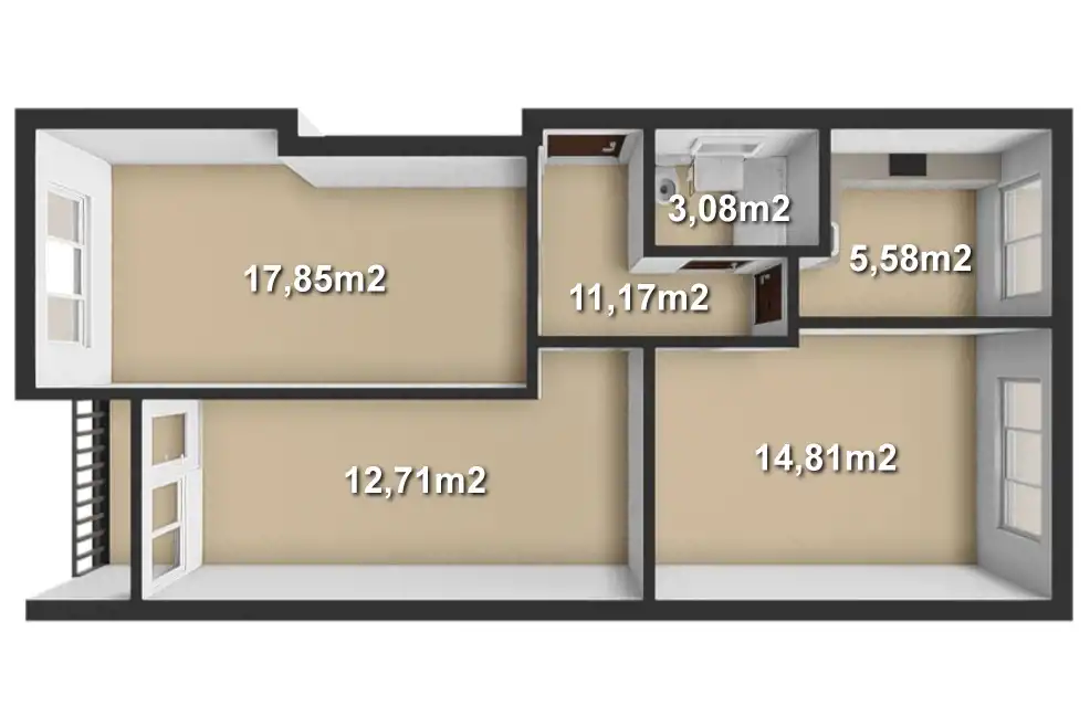 Składa się z przestronnego salonu o powierzchni 17,85m2, dwóch sypialni o powierzchniach 12,71m2 i 14,81m2, jasnej i oddzielnej kuchni o powierzchni 5,58m2, łazienki razem z WC o powierzchni 3,08m2 oraz przedpokoju o powierzchni 11,74m2