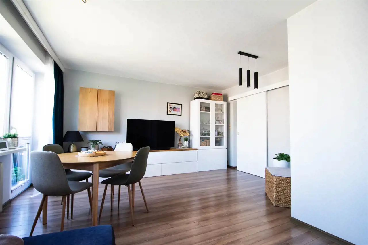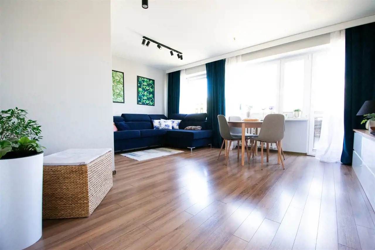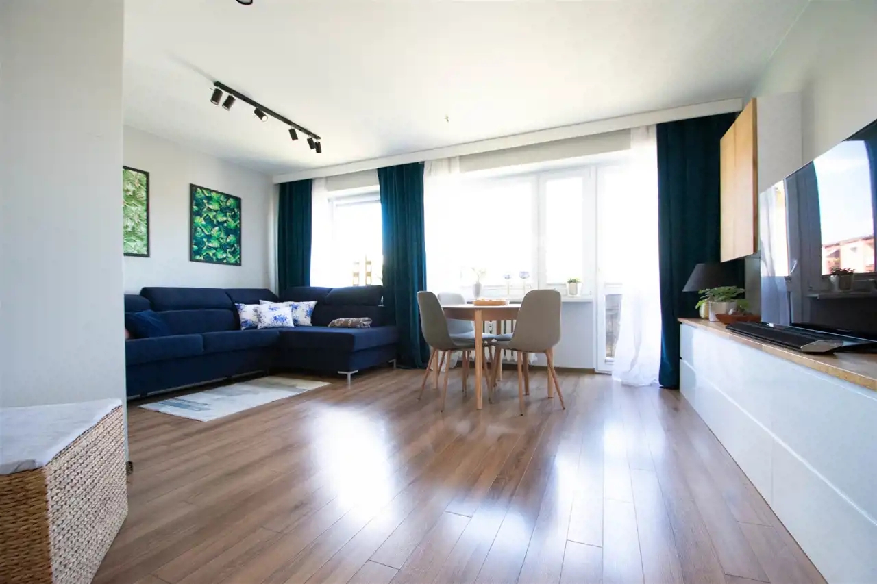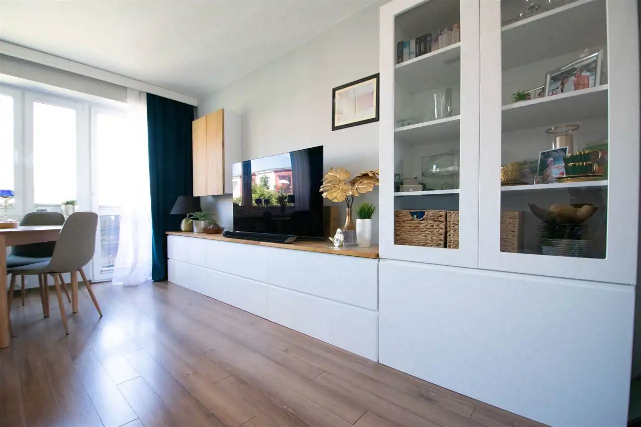 - przestronnego, dużego salonu z dwoma oknami oraz balkonem, w którym znajduje się szafka rtv, szafka wisząca, witryna, stół z krzesłami oraz rozkładana duża sofa, w tej części wydzielona jest również przestrzennej na garderobę (pierwotnie salon stanowił dwa oddzielne pokoje, istnieje możliwość powrotu do wcześniejszego układu)