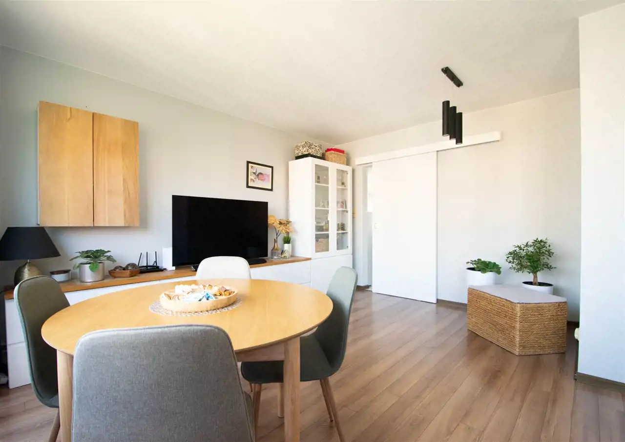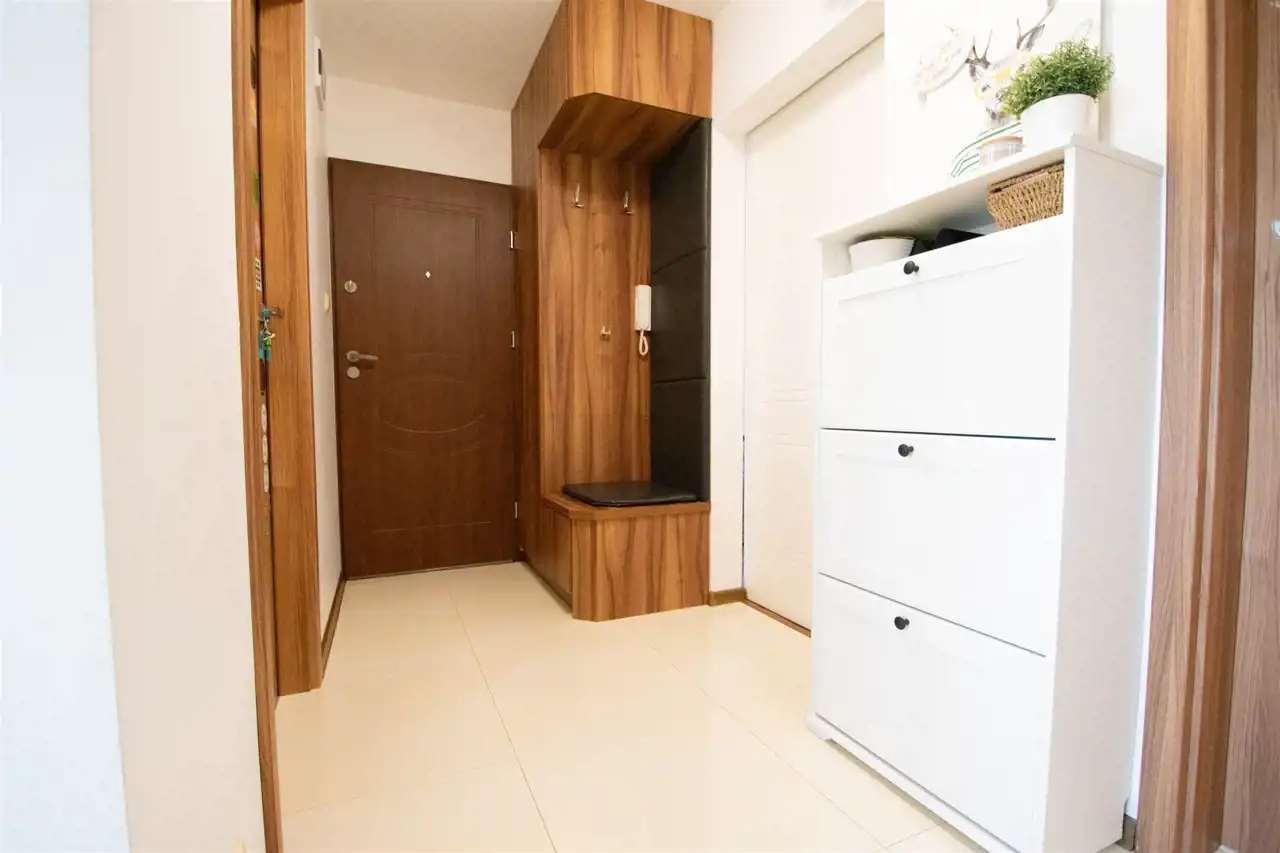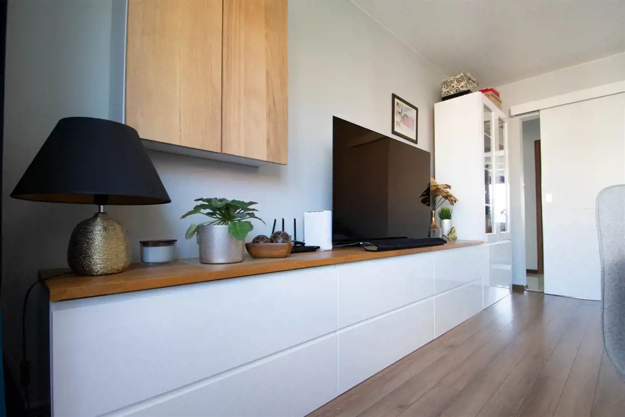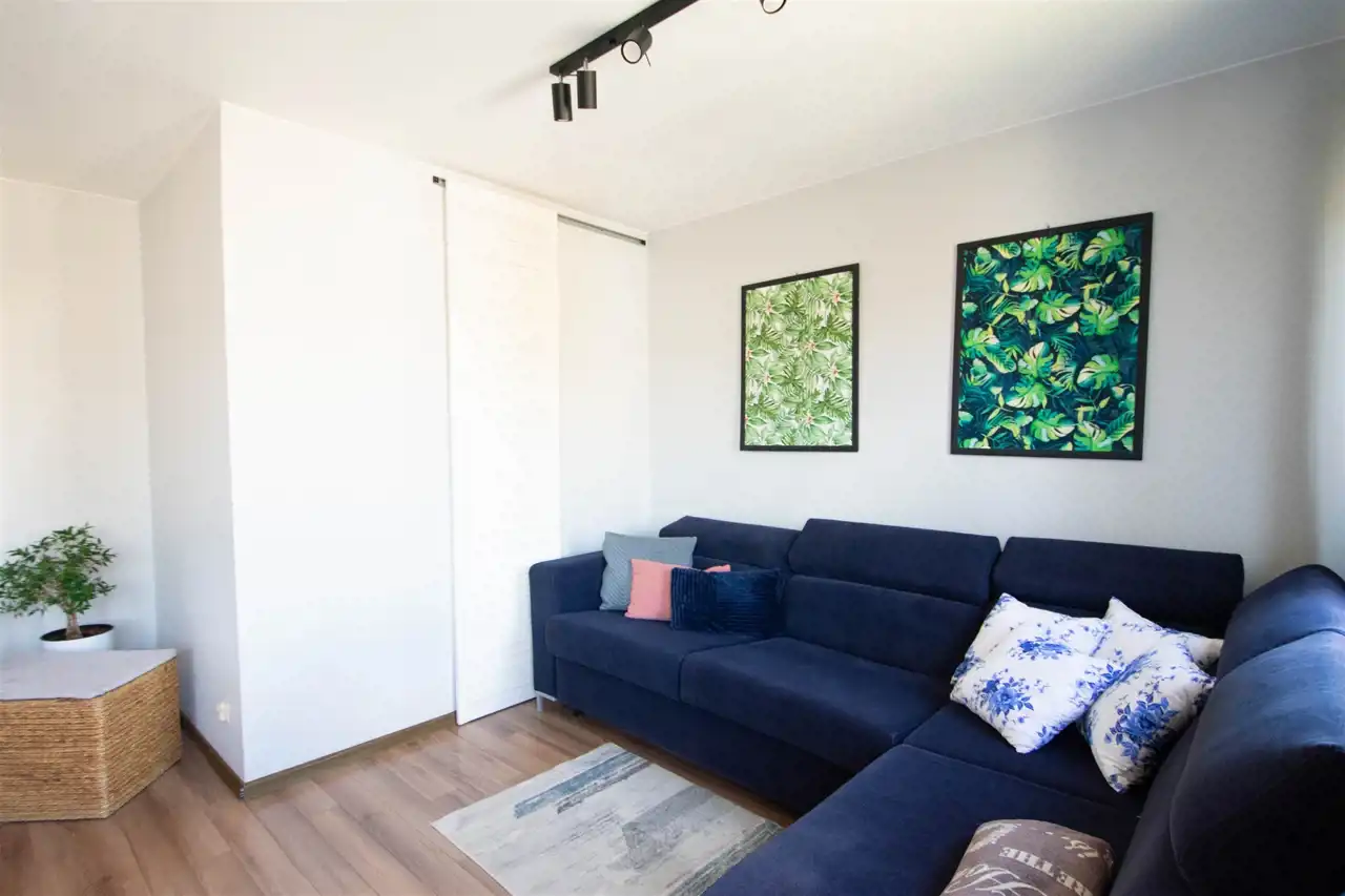 - przestronnego, dużego salonu z dwoma oknami oraz balkonem, w którym znajduje się szafka rtv, szafka wisząca, witryna, stół z krzesłami oraz rozkładana duża sofa, w tej części wydzielona jest również przestrzennej na garderobę (pierwotnie salon stanowił dwa oddzielne pokoje, istnieje możliwość powrotu do wcześniejszego układu)