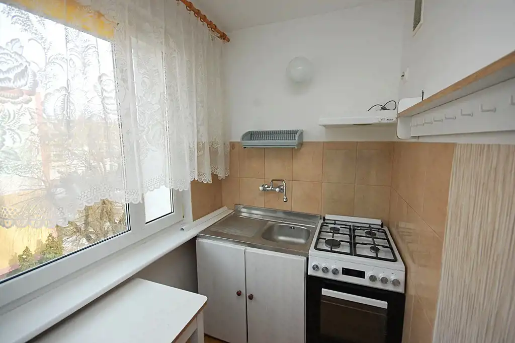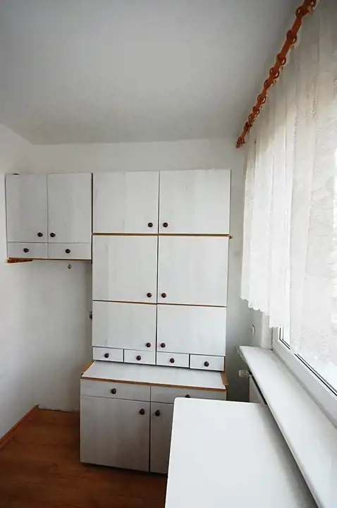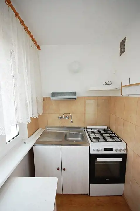 Kuchnia-ok 4m2 podłoga panele,ściany tynkowane,fartuch glazury,okno pcv,szafki wiszące i stojące,stół,kuchenka