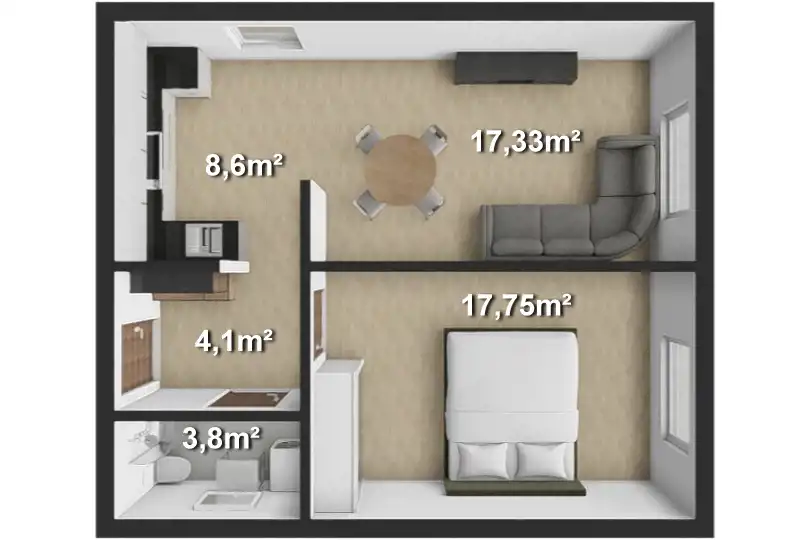 - Charakterystyka mieszkania 51.55 m2, 2 pokoje