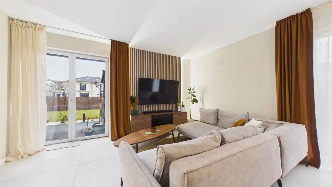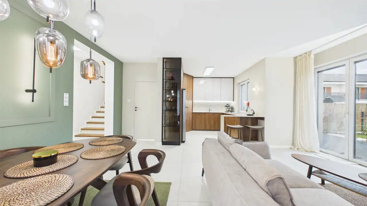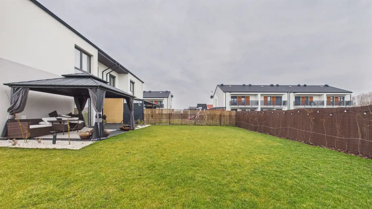 Wysoki standard wykończenia obejmuje meble na wymiar w zabudowie, materiały wysokiej jakości, ogrzewanie podłogowe na parterze i piętrze oraz przygotowane przyłącze pod klimatyzację. Zastosowanie pompy ciepła gwarantuje niskie koszty eksploatacyjne, a brak czynszu sprawia, że wszelkie opłaty naliczane są wyłącznie według zużycia.