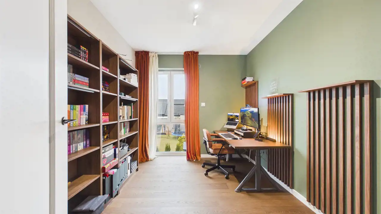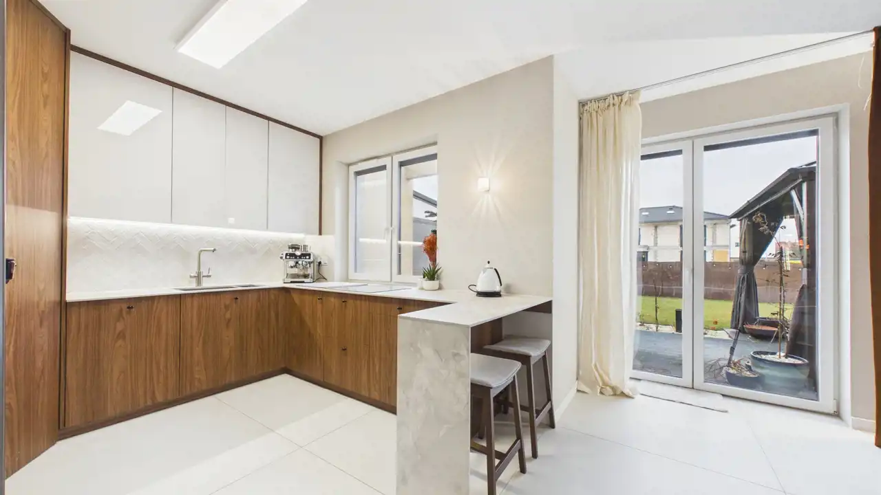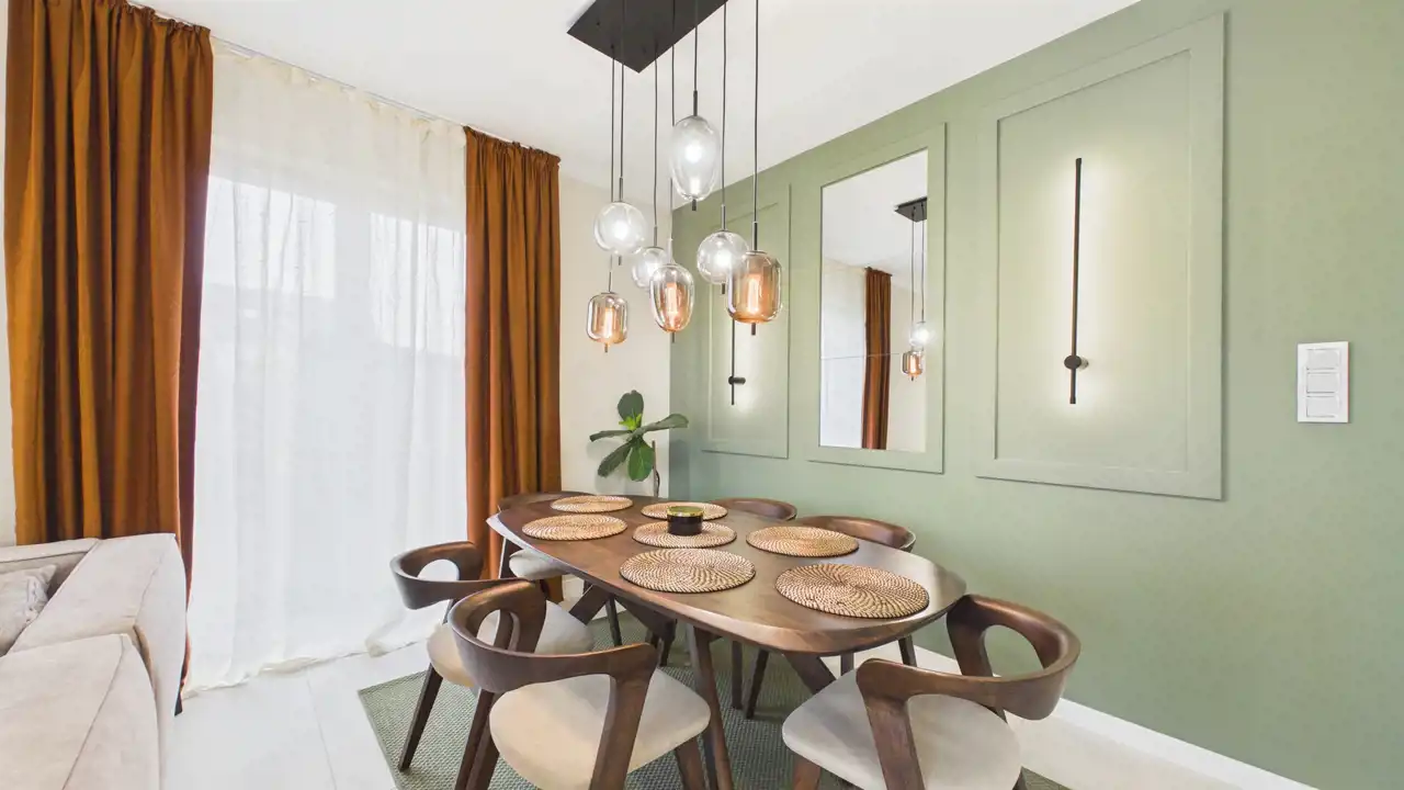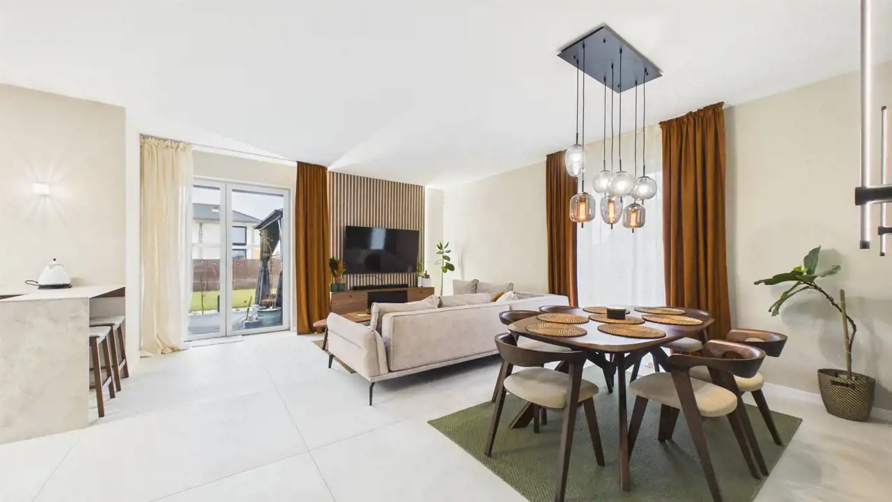 Wysoki standard wykończenia obejmuje meble na wymiar w zabudowie, materiały wysokiej jakości, ogrzewanie podłogowe na parterze i piętrze oraz przygotowane przyłącze pod klimatyzację. Zastosowanie pompy ciepła gwarantuje niskie koszty eksploatacyjne, a brak czynszu sprawia, że wszelkie opłaty naliczane są wyłącznie według zużycia.