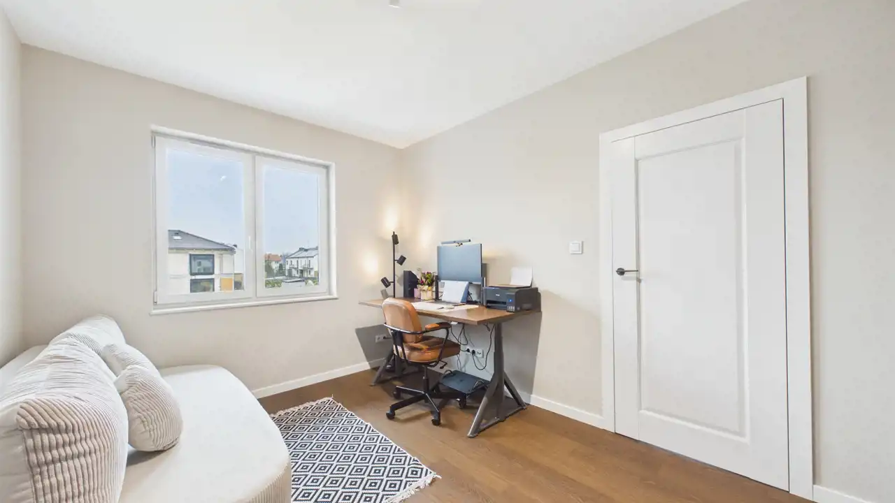 Przemyślany układ obejmuje: przestronny salon z otwartą kuchnią oraz trzy pokoje, aktualnie zaaranżowane pod sypialnię oraz 2 gabinety. Dodatkowym atutem są spiżarnia oraz pomieszczenie gospodarcze z miejscem na pralkę i suszarkę, które znacząco podnoszą komfort codziennego użytkowania, a także poddasze, oferujące dodatkową przestrzeń do przechowywania.