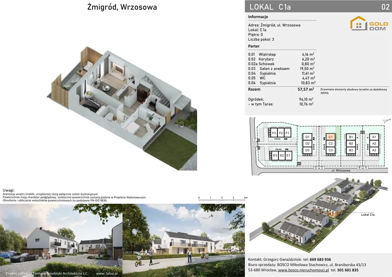 Powierzchnia użytkowa mieszkania 57,57 mkw: salon z aneksem kuchennym (19,50 mkw), 2 sypialnie (10,83 mkw, 11,61 mkw), łazienka 4,47 mkw, schowek, przedpokój i wiatrołap. Do mieszkania przynależy ogródek o powierzchni 94 mkw (w tym taras 10,76 mkw) oraz dwa naziemne miejsca parkingowe.
