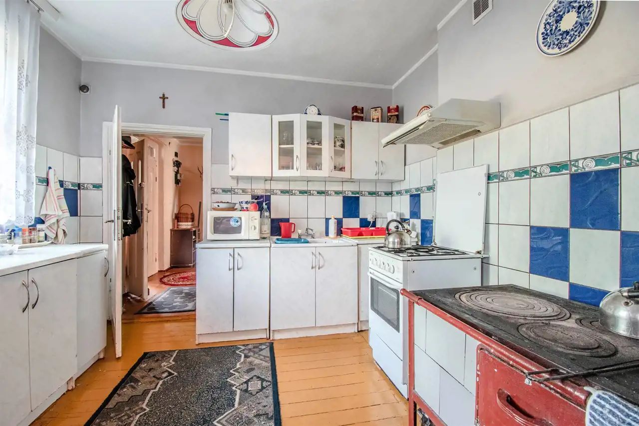 - kuchnia o powierzchni 9,18 m2 z zabudową stałą wyposażona w urządzenia AGD: kuchnia gazowa, lodówko -zamrażarka i zlewozmywak, dodatkowo jest piec węglowy.