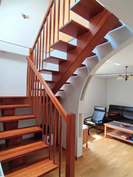 Z boku salonu elegancka, ażurowa klatka schodowa z drewnianymi stopniami prowadząca na piętro