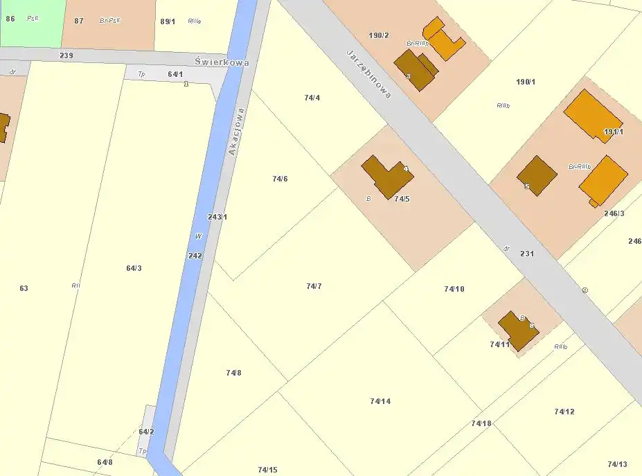 Nieruchomość o kształcie nieregularnym o pow. 2842 m2, położona przy ul. Akacjowej w otoczeniu domów jednorodzinnych. Dojazd drogą utwardzoną. W najbliższym sąsiedztwie znajduje się niska, kameralna zabudowa jednorodzinna oraz tereny zielone.