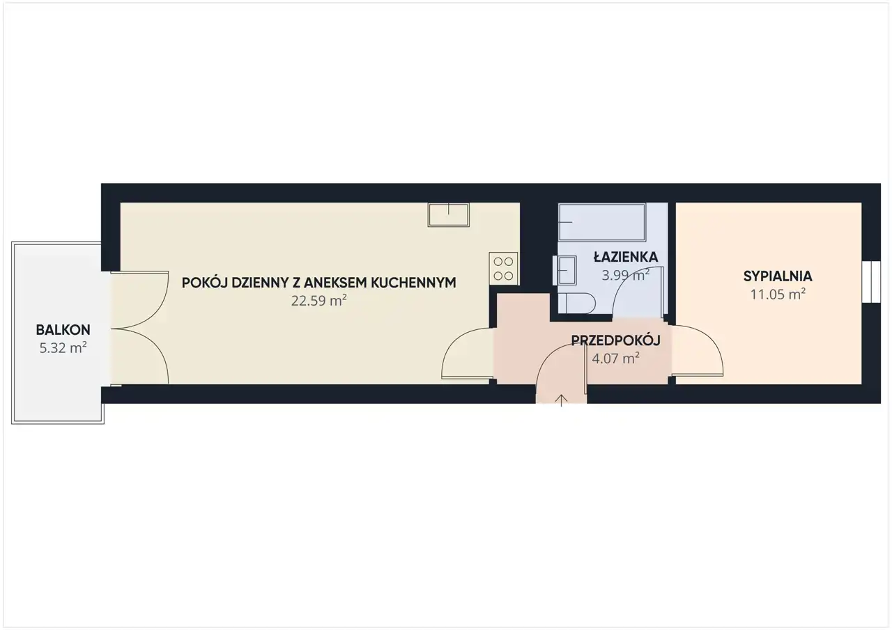 - Charakterystyka mieszkania 44.52 m2, 2 pokoje
