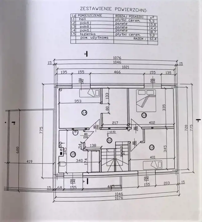 Na piętrze znajduje się hall, łazienka oraz trzy sypialnie.