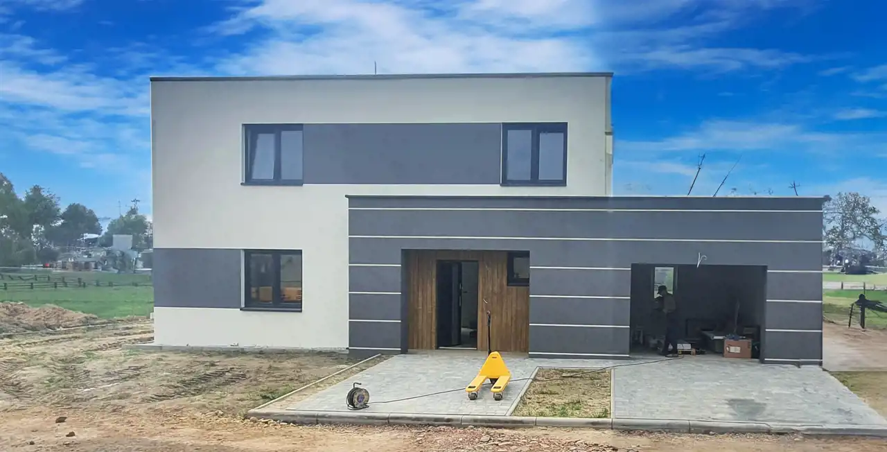 Budynek oddany w stanie deweloperskim z odbiorem budynku. Nowoczesny dom jednorodzinny, w zabudowie wolnostojącej, niepodpiwniczony z poddaszem użytkowym i garażem oraz dachem bez okapów. Położenie domu na otwartej działce oraz duże okna powoduje, że dom jest jasny oraz pełny słońca. Taras znajduje się od strony południowej. Chodnik przed domem wybrukowany oraz opaska wokół budynku utwardzona pod kostkę brukową.