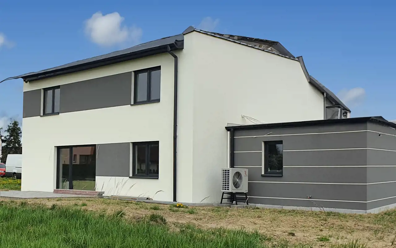 - elewacja ocieplona styropianem 15cm, pokryta tynkiem silikonowym z elementami ozdobnymi