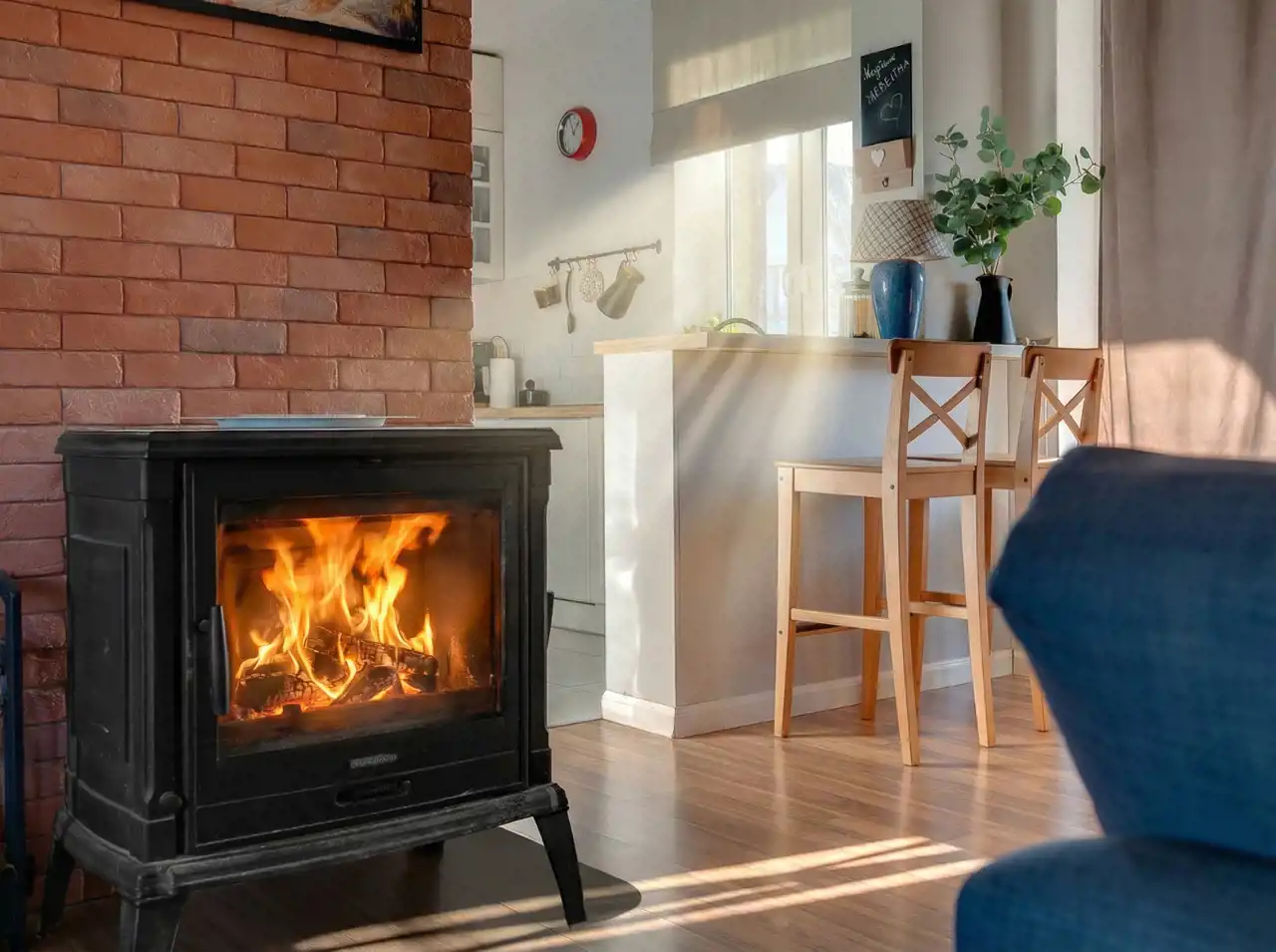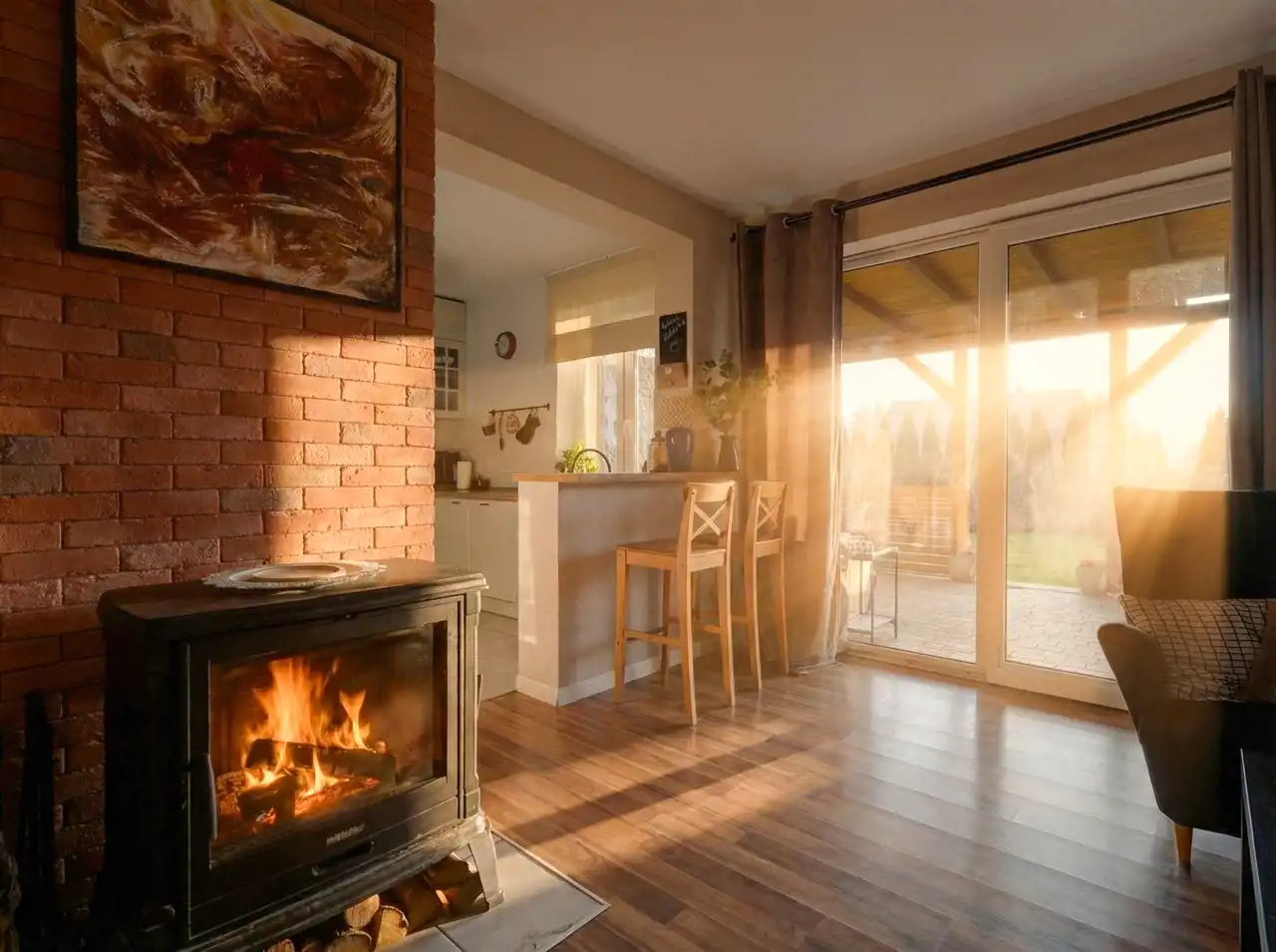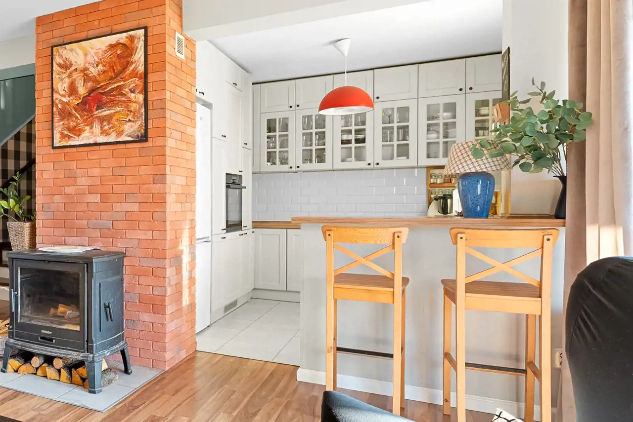 - Dom ogrzewany jest ekonomicznym piecem na pellet, który zapewnia stabilne i komfortowe ciepło.
