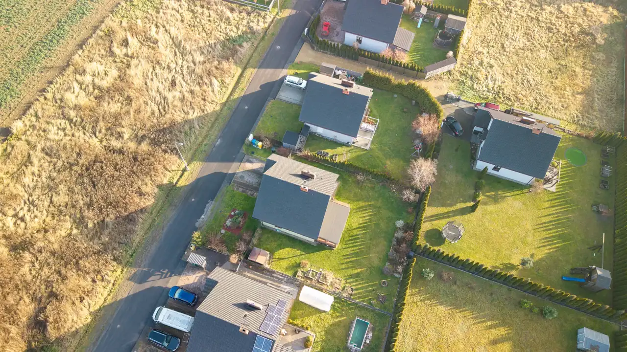 Dom stoi na idealnie ustawnej działce o powierzchni 633 m², z wygodnym dojazdem asfaltową drogą. Na terenie posesji znajduje się podjazd na dwa auta, a dodatkowym atutem jest garaż w bryle budynku, który znacząco podnosi komfort codziennego użytkowania.