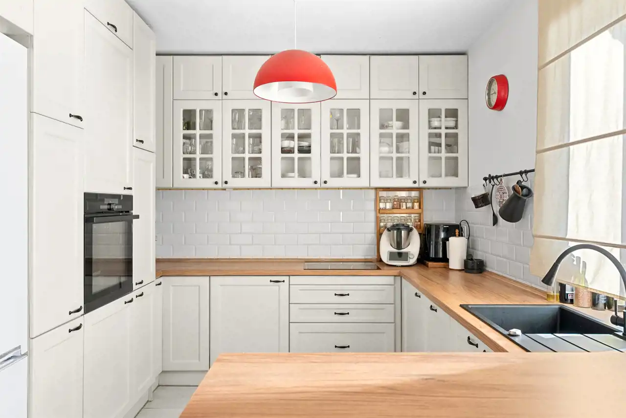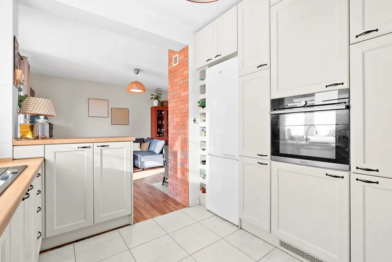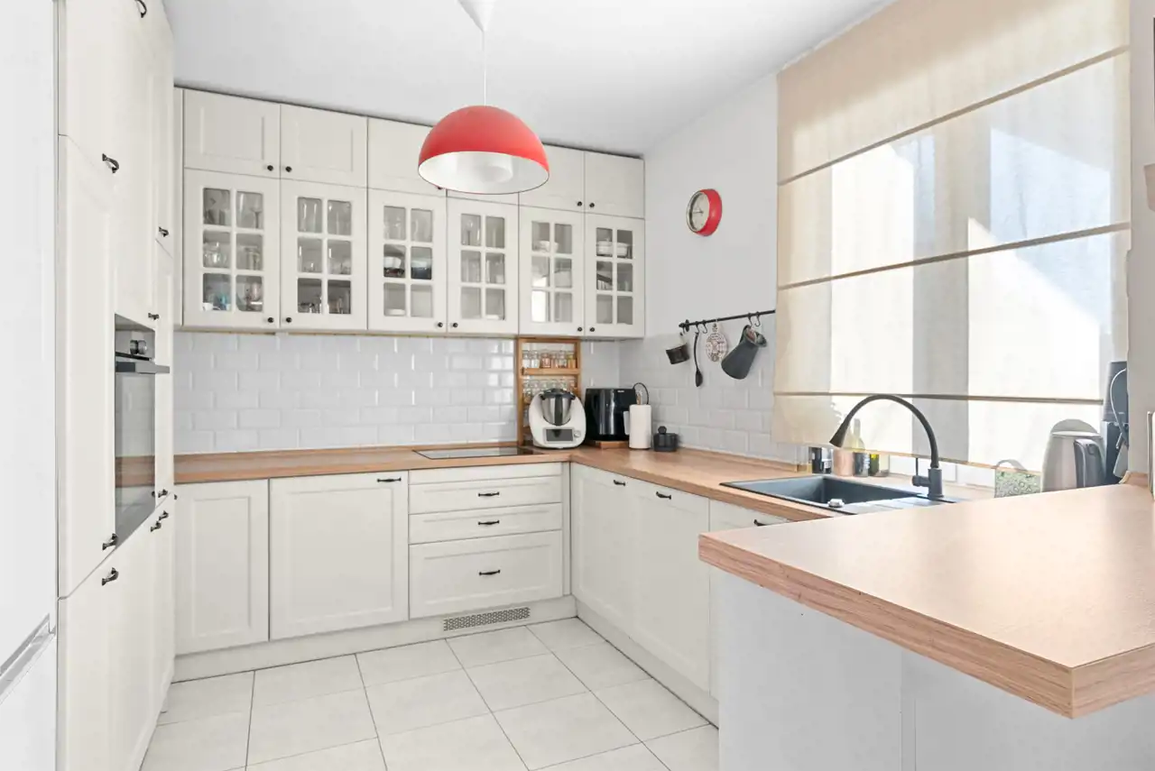 - Kuchnia to niewątpliwie mocny atut — przestronna, wykonana na wymiar przez stolarza, w pełni wyposażona w sprzęt AGD.