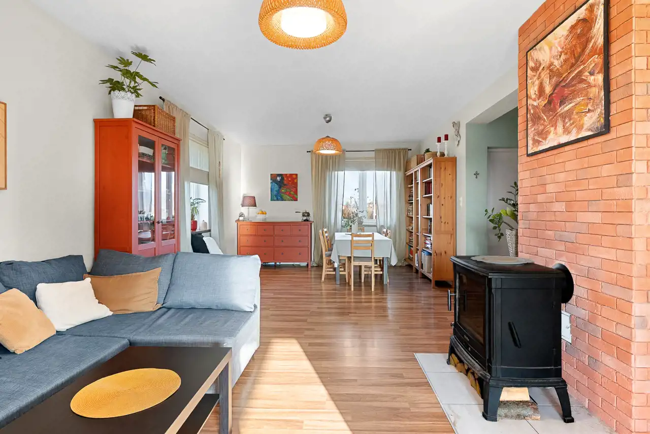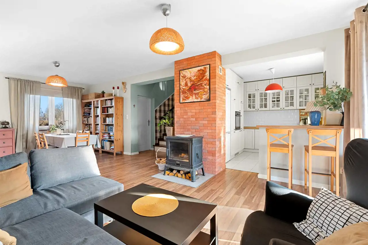 - Centralnym punktem strefy dziennej jest klimatyczny kominek, który tworzy wyjątkowy nastrój w zimowe wieczory i może służyć jako dodatkowe źródło ciepła.