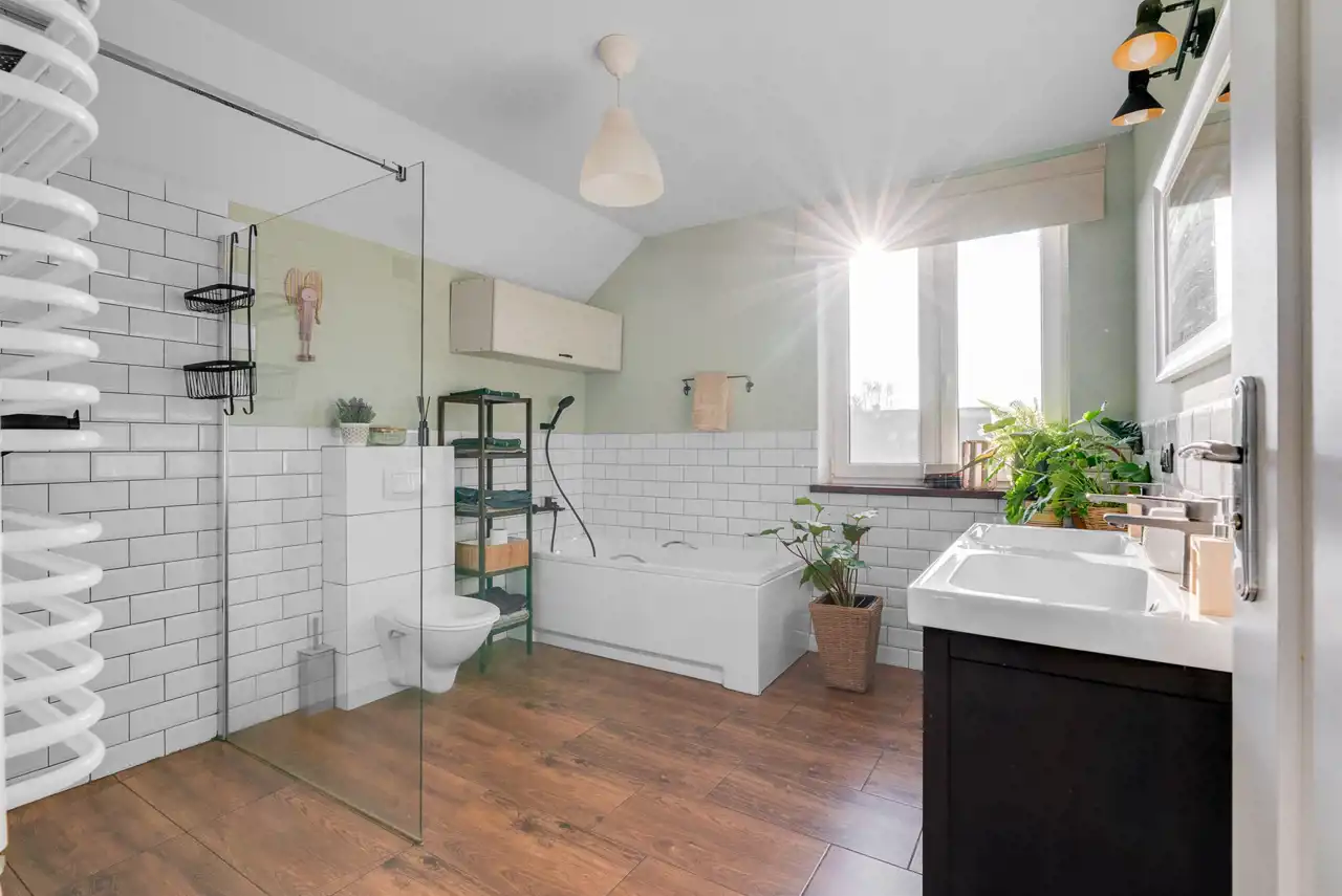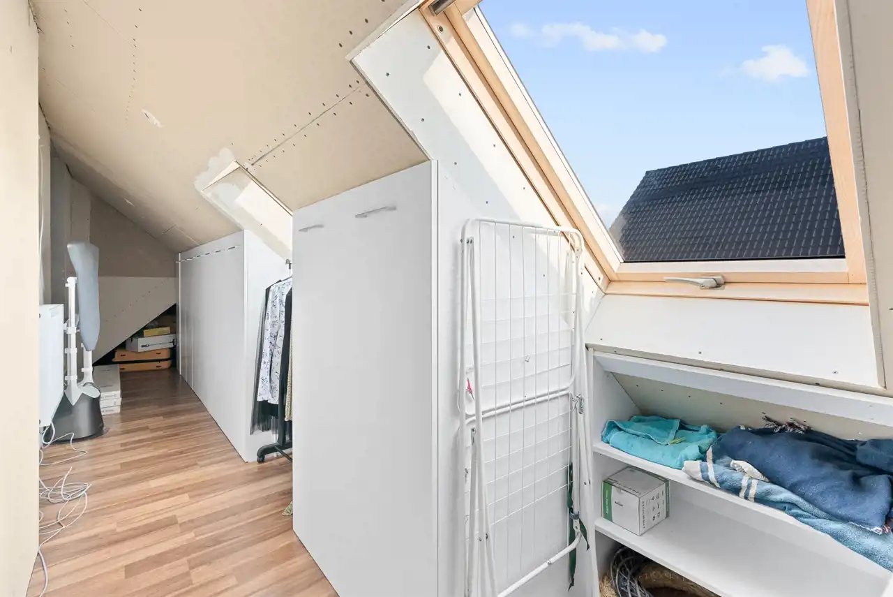 Dom posiada także duże poddasze, idealne na przechowanie rzeczy sezonowych, walizek, ozdób i wszystkiego co chcesz mieć w domu, ale niekoniecznie na widoku. To ogromna przestrzeń, która pozwala utrzymać porządek w części mieszkalnej.