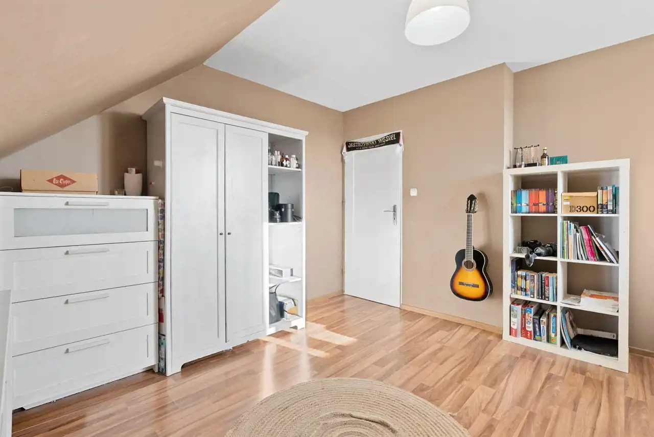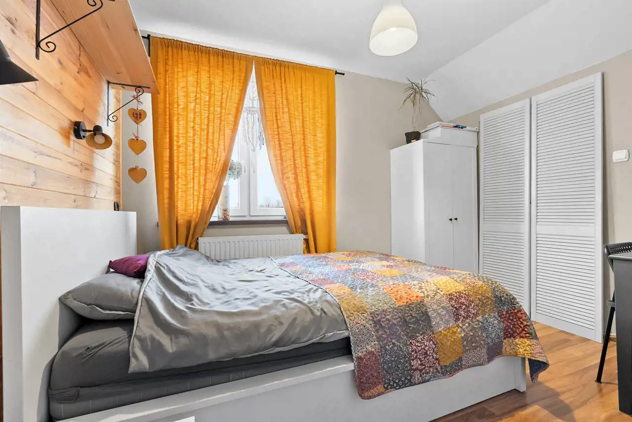 Piętro to idealna przestrzeń do odpoczynku i prywatności. Znajdują się tu trzy przestronne pokoje, które można dowolnie zaaranżować na sypialnię, pokój dziecka, gabinet czy strefę hobby. Główna sypialnia posiada wyjście do dużej garderoby wyposażonej w pełne podłączenia pod pralkę i suszarkę. To wyjątkowo praktyczne rozwiązanie, które pozwala wygodnie organizować codzienność.