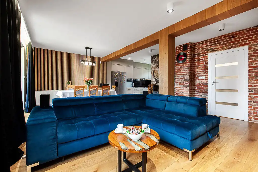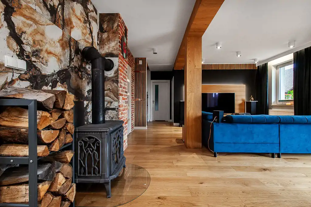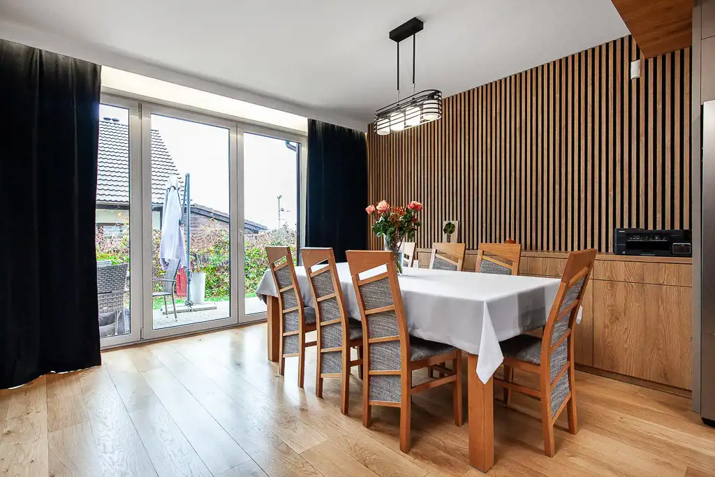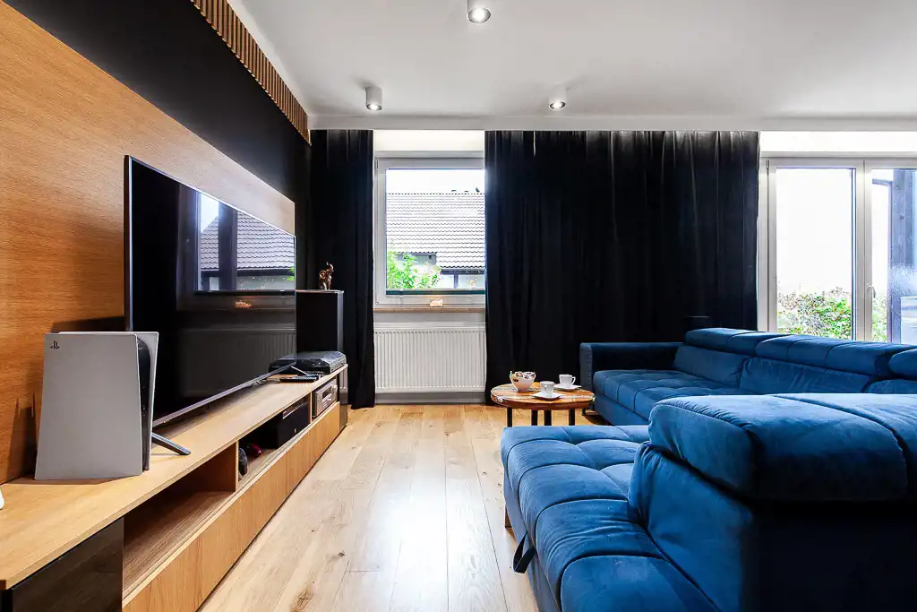 Cała nieruchomość jest ciepła i przyjemna, bazuje na klasycznych kolorach: eleganckiej czerni i gustownej bieli w połączeniu z drewnem oraz wysokogatunkowym gresem, W całym domu poza strefami mokrymi podłoga wykończona jest ciepłą, naturalną deską dębową. Ogrzewanie podłogowe znajduje się w strefach mokrych.