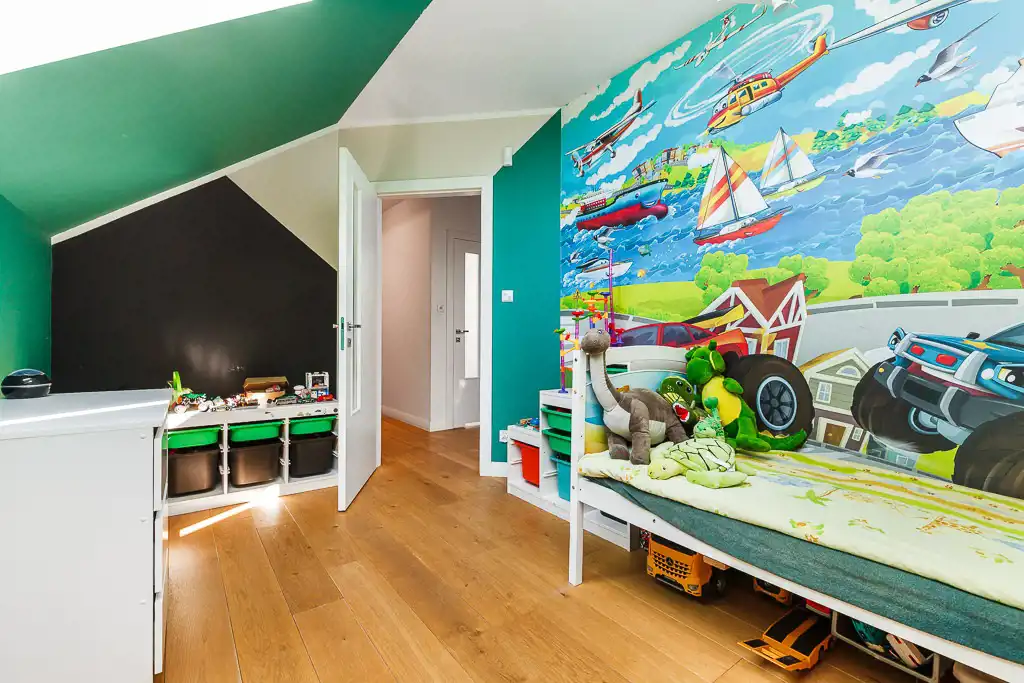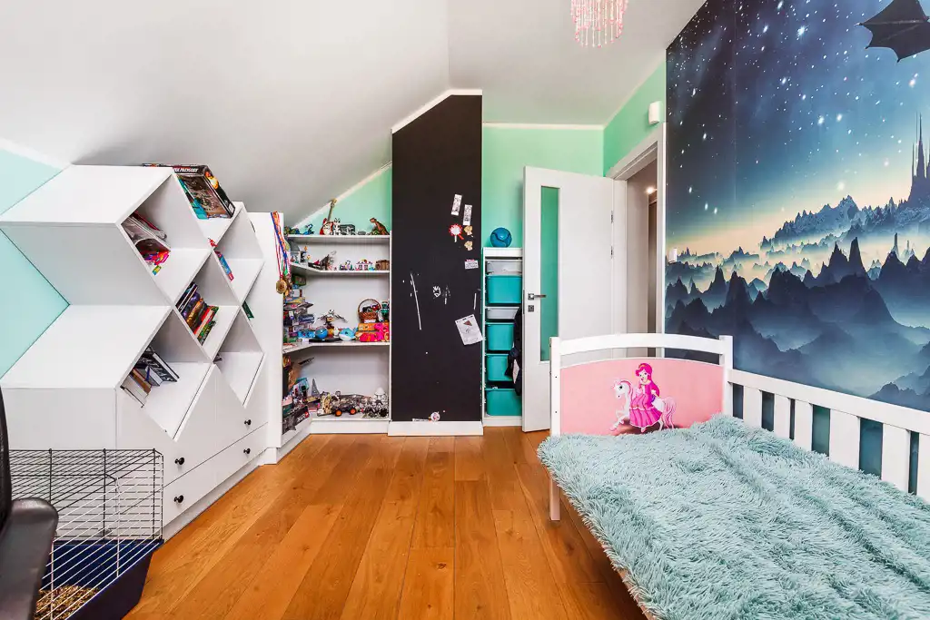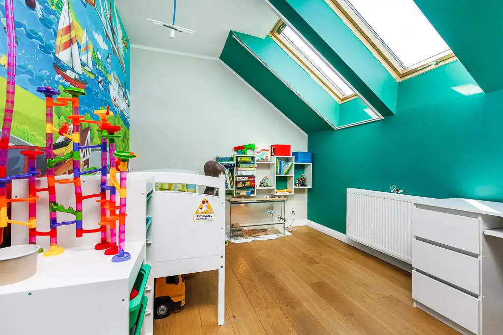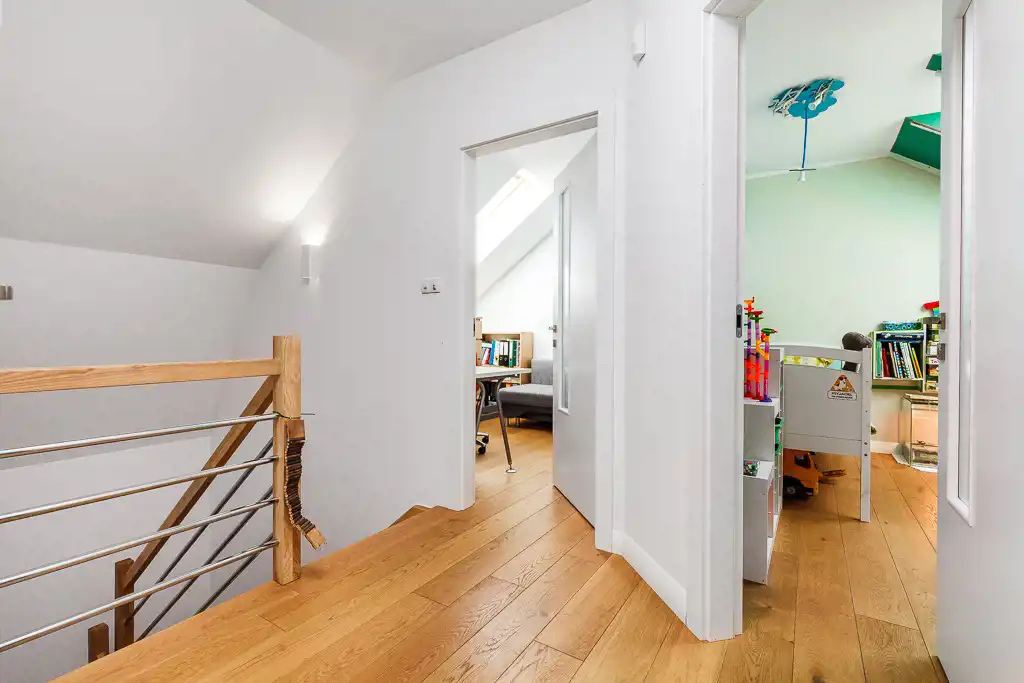 Na piętrze znajdują się garderoba, łazienka i 4 pokoje. 2 z nich zostały zaaranżowane na dziecięce, 1 biuro, 1 pokój gościnny. Jest możliwość wyburzenia ścian między pokojami i przerobienia 4 mniejszych na 2 większe (ok. 19 m2 pow. Użytkowej, 25 m2 całkowitej).