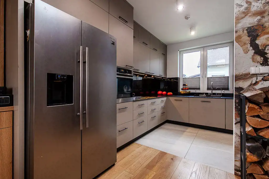 Zabudowy zostały wykonane przez stolarza na podstawie indywidualnych projektów. Na podłogach leży głównie deska dębowa W kuchni zastosowano systemy bloom z dożywotnią gwarancją. Fronty wykonane są z akrylu w macie. Zabudowa maksymalnie wykorzystuje przestrzeń w kuchni. Każdy zakamarek został zaplanowany w taki sposób, żeby był jak najbardziej funkcjonalny. Dlatego na przykład w dolnych szafkach został zastosowany system narożny magic corner. Kuchnia w pełni wyposażona w sprzęt AGD: pojemna lodówka side-by-side z kostkarką, piekarnik z pyrolizą, indukcja, okap, zmywarka, kuchenka mikrofalowa, ekspres do kawy De Longi. Dodatkowym atutem jest niezbędnik kuchenny w postaci spiżarki. Kuchnia jest świeżo po remoncie: nowoczesne kompaktowe blaty imitujące zastygniętą lawę - robią wrażenie i są niesamowicie praktyczne. Do tego nowe czarne hartowane szkło między szafkami oraz designerski wielofunkcyjny zlewozmywak i nowy gres hiszpański na podłodze.