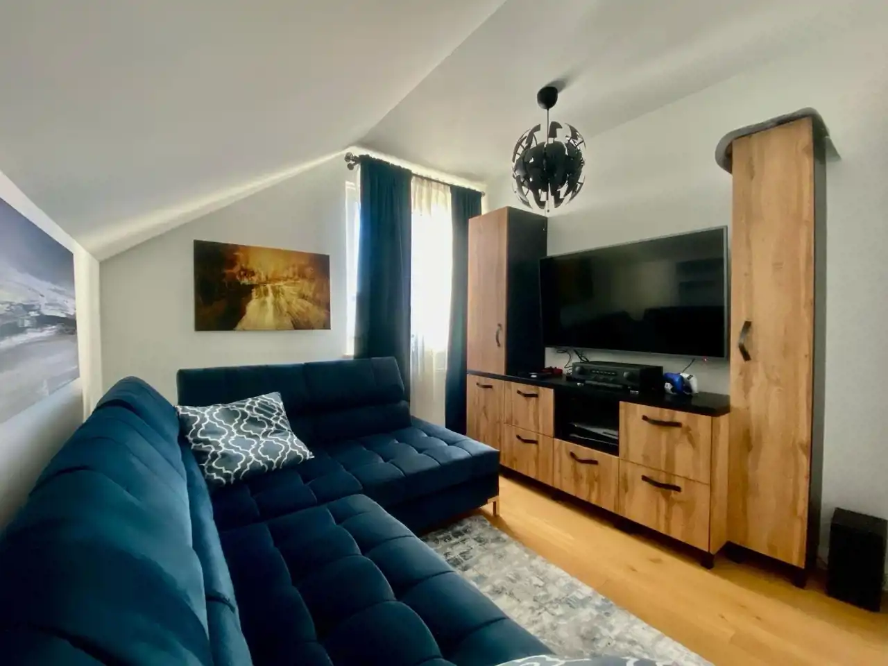 Kuchnia jest otwarta na przestronny salon z częścią jadalnianą i wyjściem na taras. Taras jest nasłoneczniony przez cały dzień (S-W). Część multimedialna podświetlona jest trzystrefowo z góry oraz dodatkowo zabudowa wyposażona jest podświetleniem led. Dodatkowe ogrzewanie drewnem w klasycznej piecu typu "koza".
