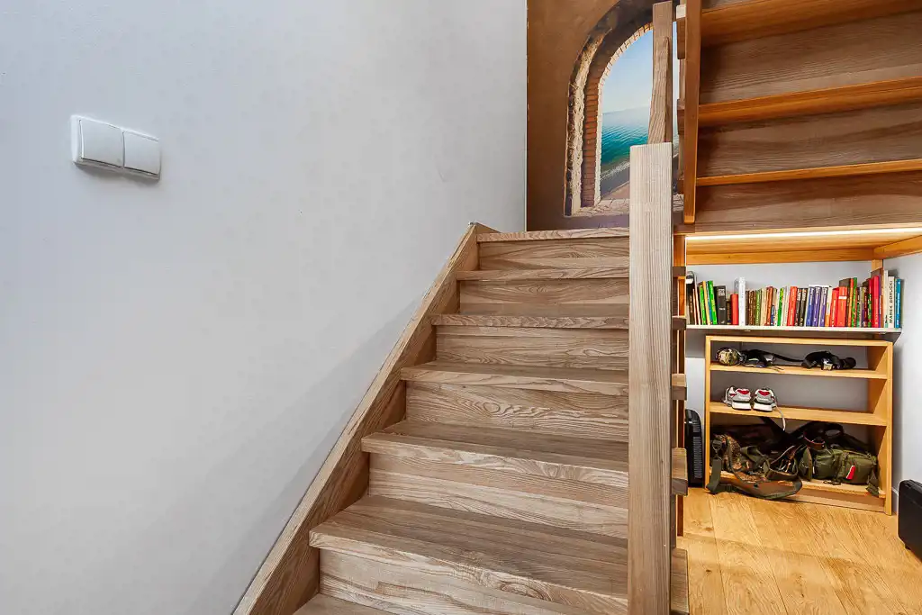 Dodatkowa przestrzeń pod schodami. Jest możliwość zabudowy - tym czasem służy jako przechowalnia walizek oraz mała biblioteczka.