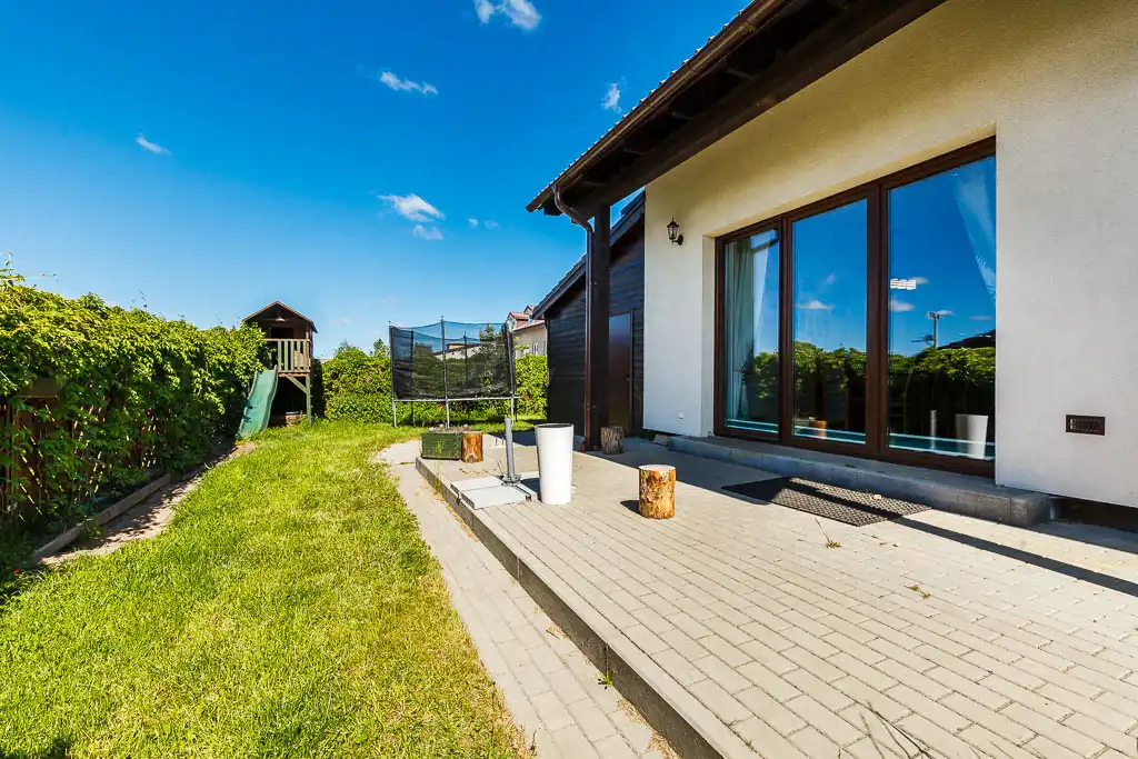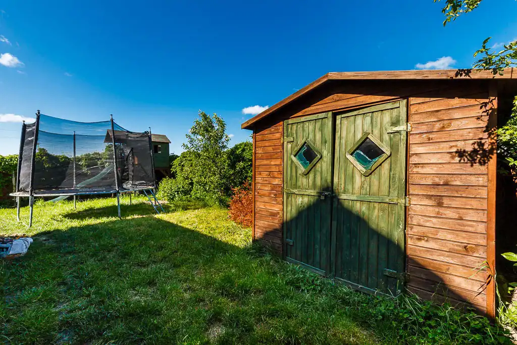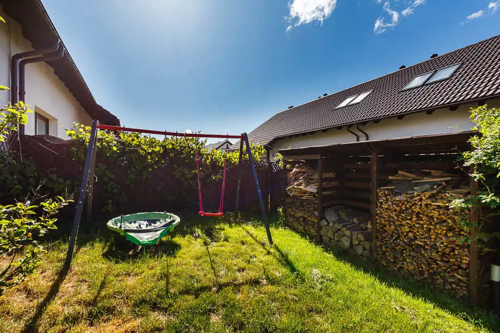 Na podwórku do dyspozycji jest cały plac zabaw: huśtawki, piaskownica, trampolina, domek dla dzieci ze zjeżdżalnią. Dodatkowo na ogrodzie znajduje się przestronny drewniany domek narzędziowy (4,5m2) oraz drewutnia. Na nieruchomości został zagospodarowany mini sad: winogrona, jabłka, śliwki, czereśnie, pigwa.
